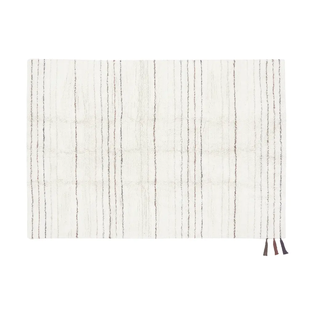 The Arona rug is tufted in soft non-dyed Sheep White color with a simple yet beautiful pattern of thin stripes of blended yarns from a range of eleven different colors from our Woolable color chart. Available in rectangular and round shapes and finished with tricolor tassels sticking out from the edge. Features