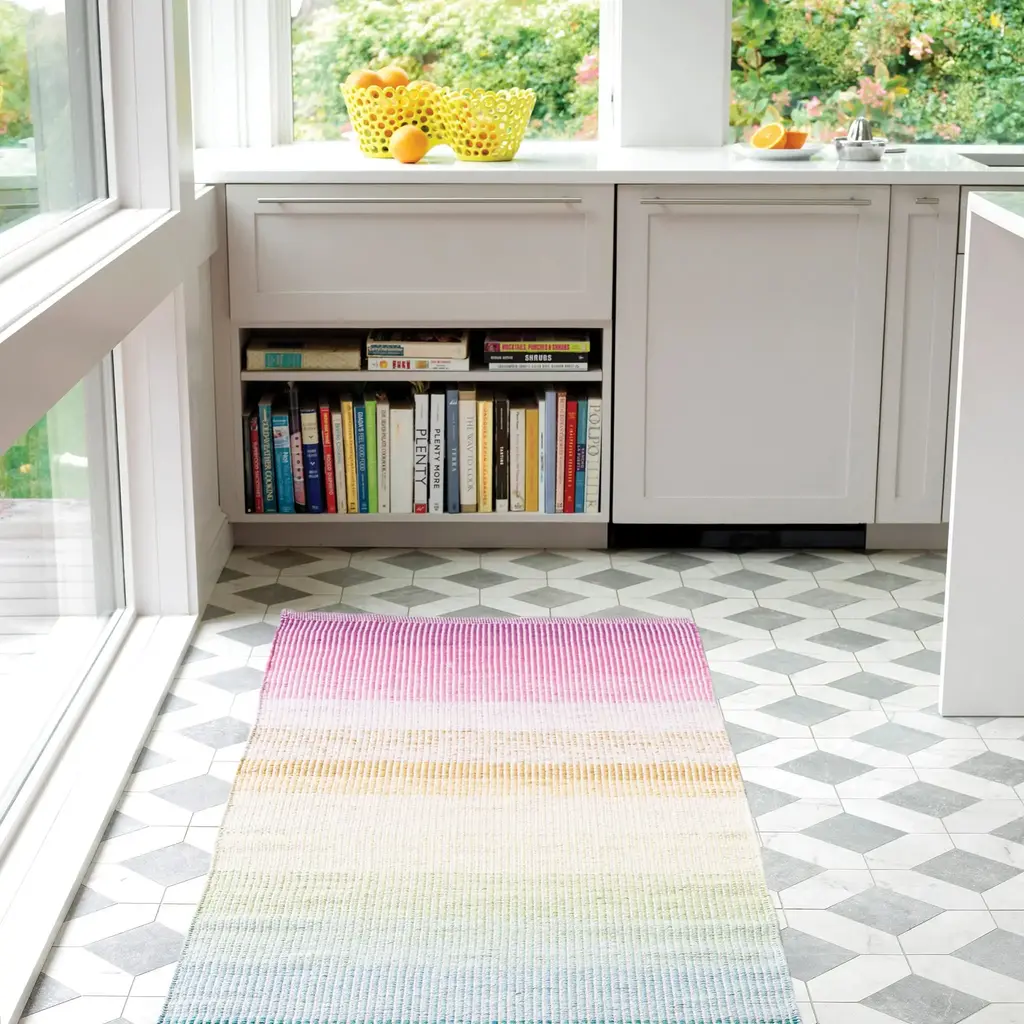 A mirage of degrade stripes in a bouquet of happy colors infuses our signature flat weave cotton rug in a vibrant creative blast. The new best friend to our Blossom bedding collection.