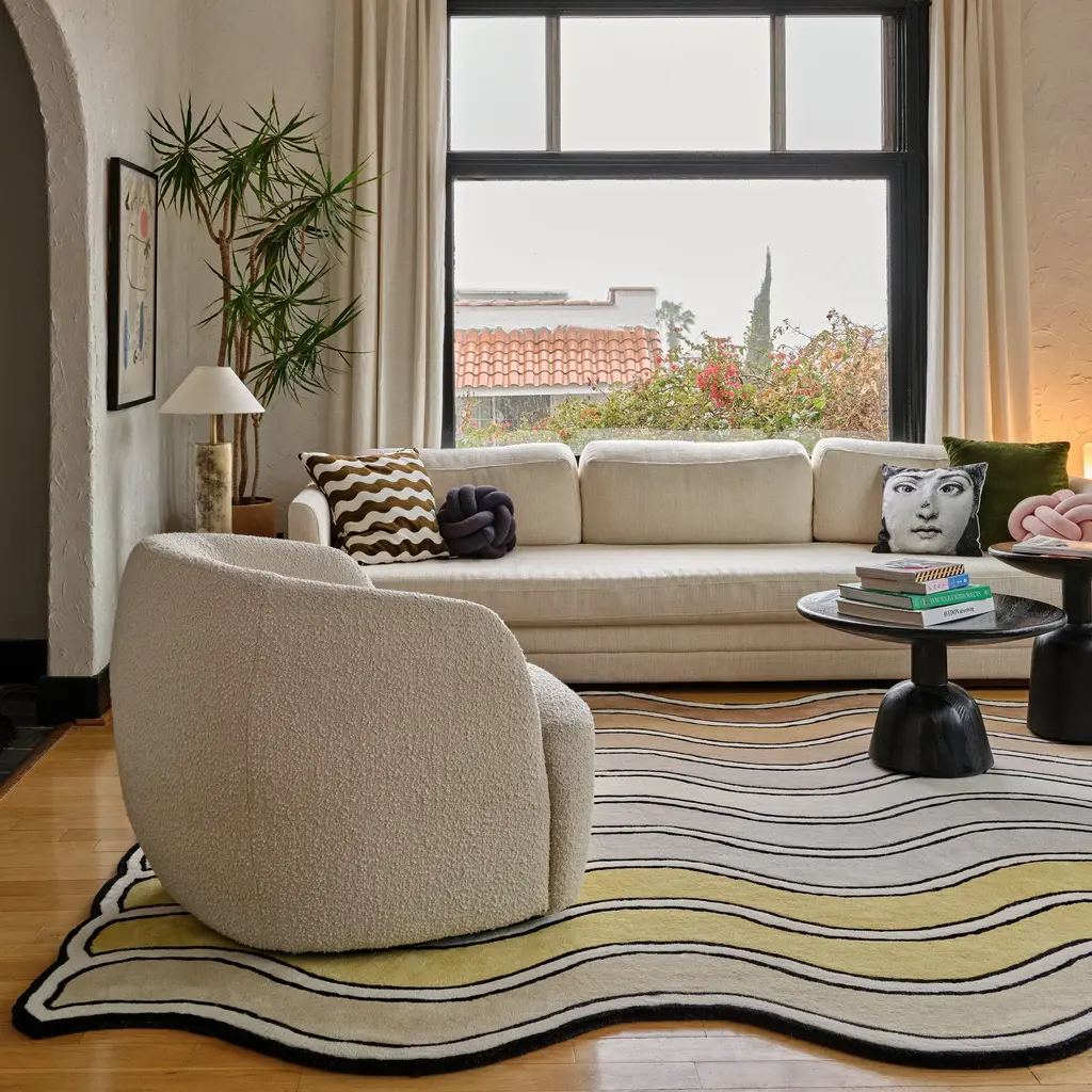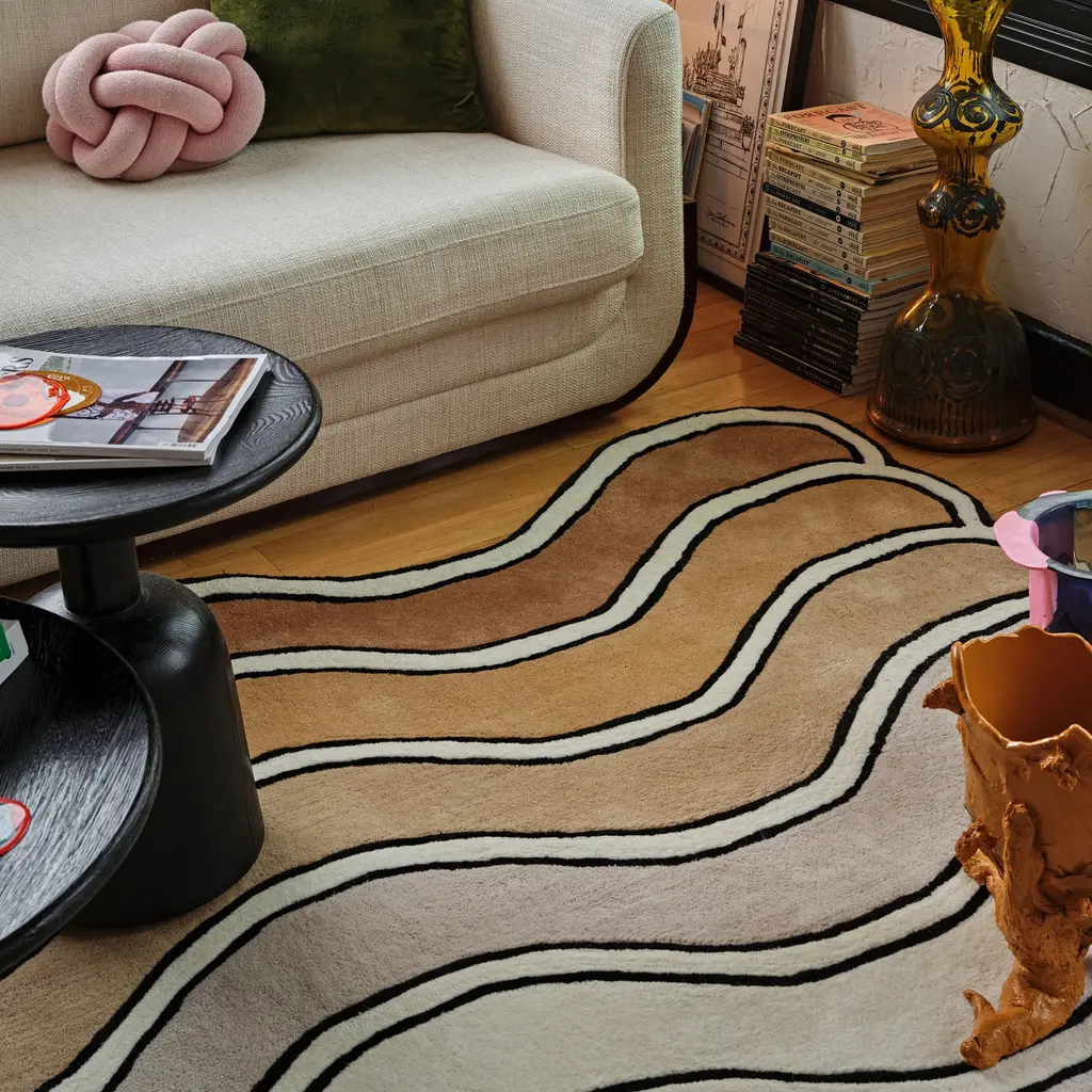 A celebration of playful, dynamic energy, the Wavy Desert Rug from Pieces is designed to animate your home with color and movement. This stunning rug is handmade in India from hand-dyed, premium New Zealand wool for a luxurious feel. Its design of undulating stripes creates an exaggerated sense of motion, while varied hand-tufting techniques result in multiple pile heights for a rich, sculptural texture. A fusion of contemporary artistry and traditional craft, it’s a bold and unforgettable centerpiece. Highlights: