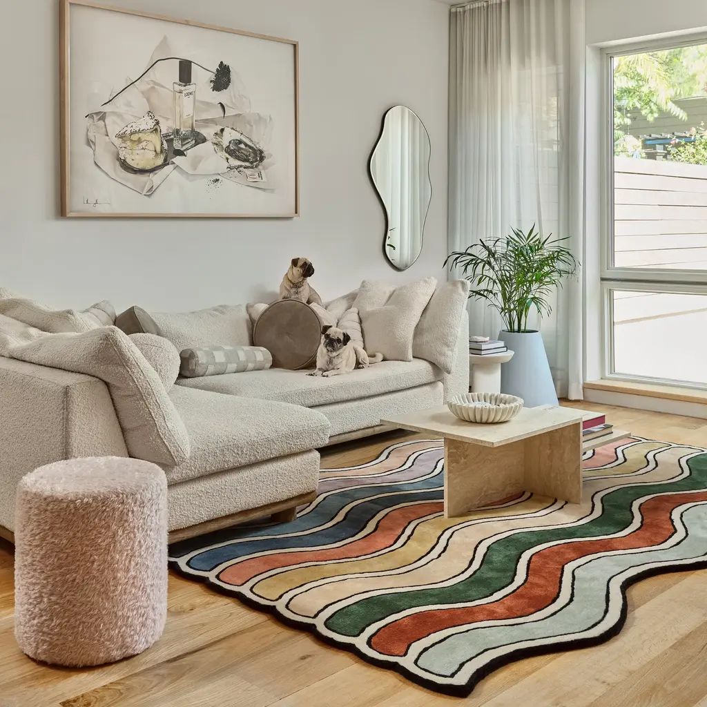 A celebration of playful, dynamic energy, the Wavy Jewel Rug from Pieces is designed to animate your home with color and movement. This stunning rug is handmade in India from hand-dyed, premium New Zealand wool for a luxurious feel. Its design of undulating stripes creates an exaggerated sense of motion, while varied hand-tufting techniques result in multiple pile heights for a rich, sculptural texture. A fusion of contemporary artistry and traditional craft, it’s a bold and unforgettable centerpiece. Highlights: