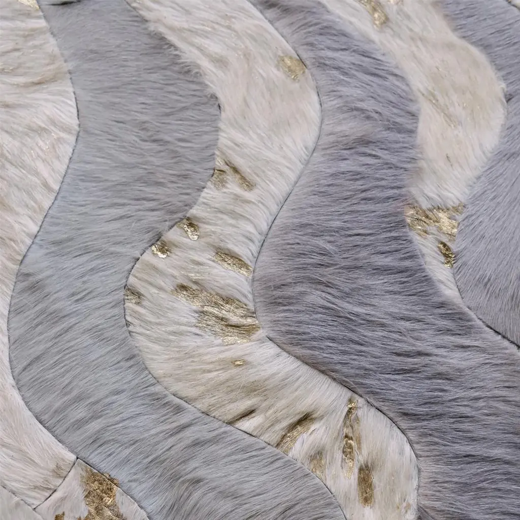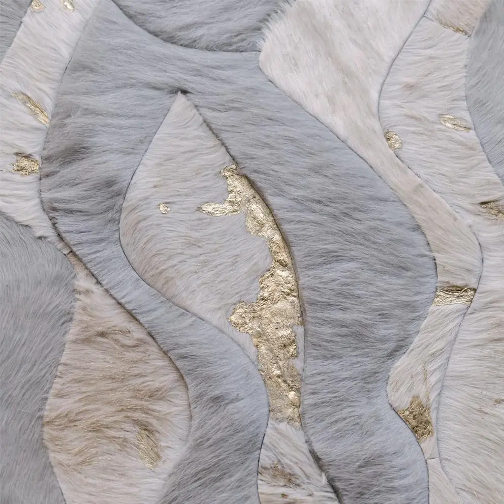 Make heads turn with the show-stopping new Susurro Rug in cream and gray. This grand scale masterpiece will bring glamor and a major wow factor into your interior.This Susurro features large format tiles in a gentle waves pattern in a striking yet simple color palette of creams and gray, punctuated with glittering gold. Or, opt for a silver or rose gold alternative (or no metallic, if you prefer).Utilizing Art Hide’s new Fusion stitchless construction technique, the rug’s finish is luxurious with longer hair and plush base (0.5cm/0.25inch) for a softer, cushier feel.The Susurro is fully customizable to any size, shape or color.