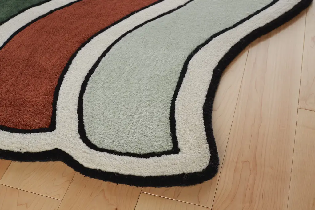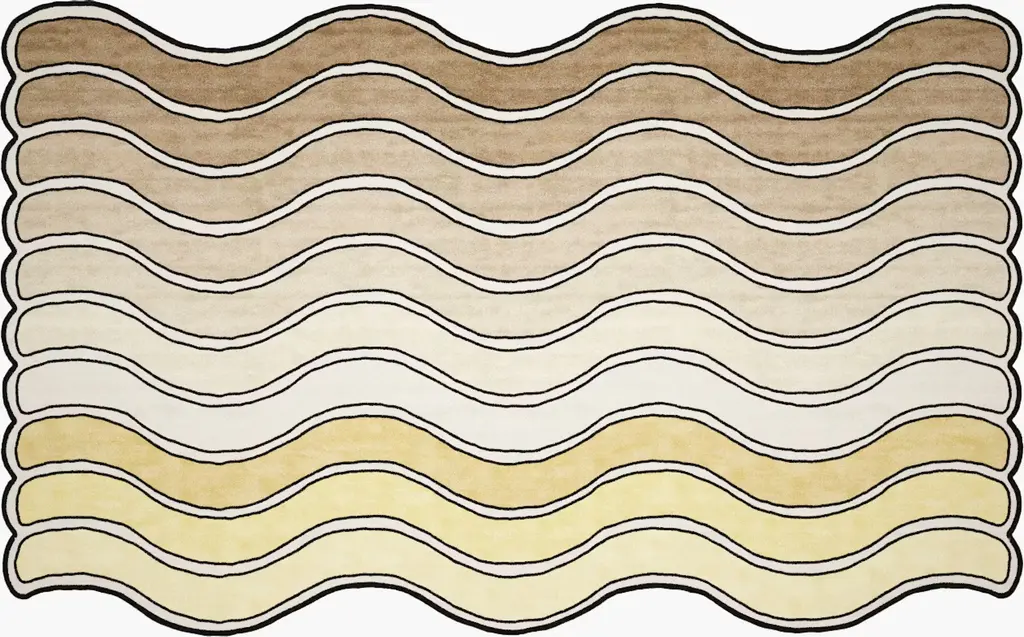The Wavy Rug Collection (2021) began as an exhibition project. Drawing from their roots in fashion and interior design, creators An Aesthetic Pursuit started with a single rug that featured ripples in a rainbow of hues. They then extracted snippets of that design, magnifying those sections to create rugs of different sizes, shapes, and color combinations. Made of hand-dyed wool, this beautiful, durable rug suits high-traffic contract and residential areas such as hallways and living rooms. Made in India.