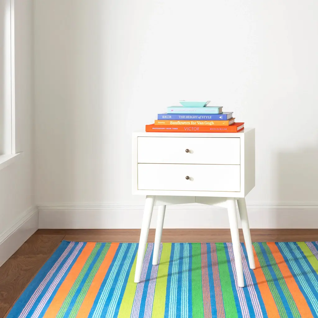 Brilliant, bright, and beautiful. Regimental stripes get an unpredictable style update with a retro color palette. Available in fresh and fun colorways to suit every mood. Constructed using a hand loomed dhurrie flat weave in durable, soft cotton. These rugs are dense, reversible, hardwearing, and affordable. Find bold comfort underfoot everywhere you step.
