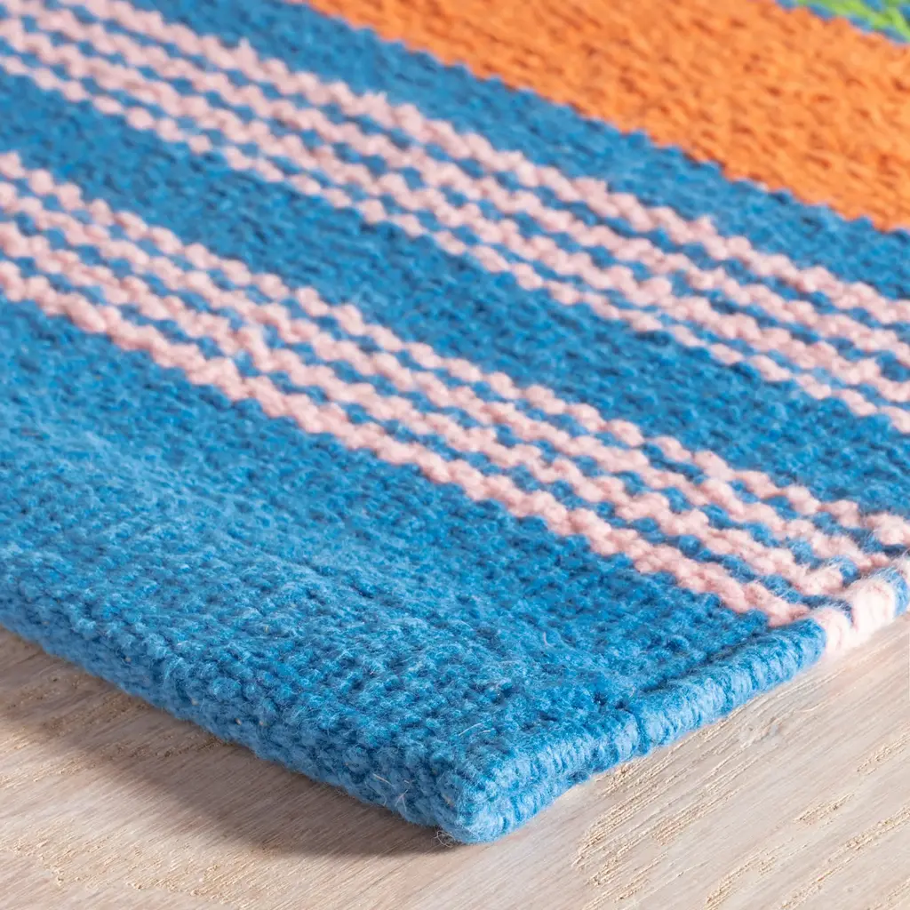 Brilliant, bright, and beautiful. Regimental stripes get an unpredictable style update with a retro color palette. Available in fresh and fun colorways to suit every mood. Constructed using a hand loomed dhurrie flat weave in durable, soft cotton. These rugs are dense, reversible, hardwearing, and affordable. Find bold comfort underfoot everywhere you step.