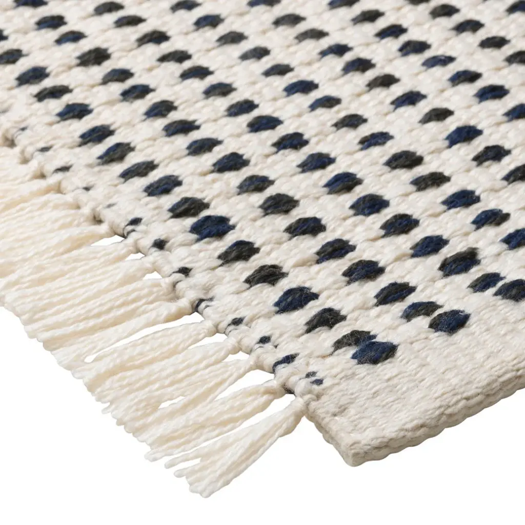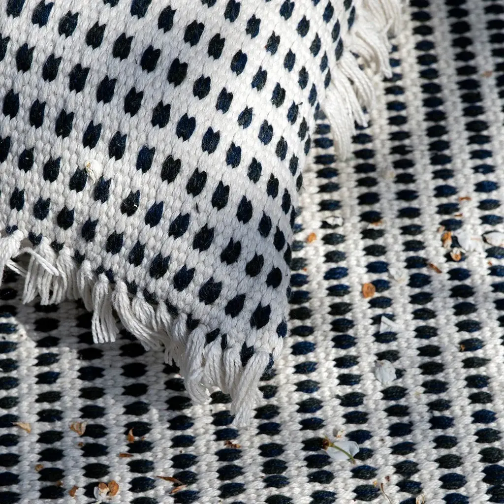By up-cycling used plastic bottles, the Way series presents an incredibly durable line of sustainable designs which can be used outside. The woven recycled polyester gives the items a lovely texture in colors associated with the maritime motif. The mat has a classic look with a twist created by the asymmetry of the fringes along two sides.