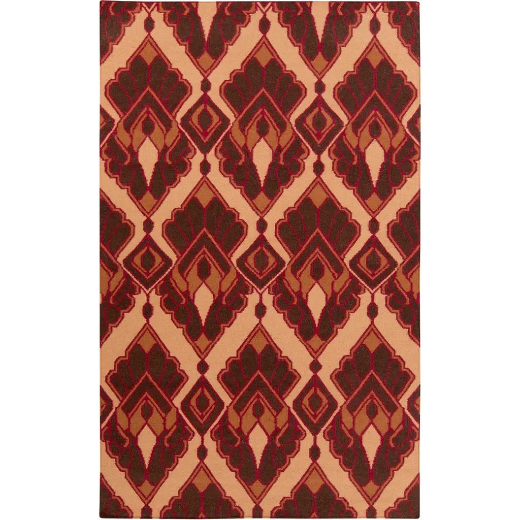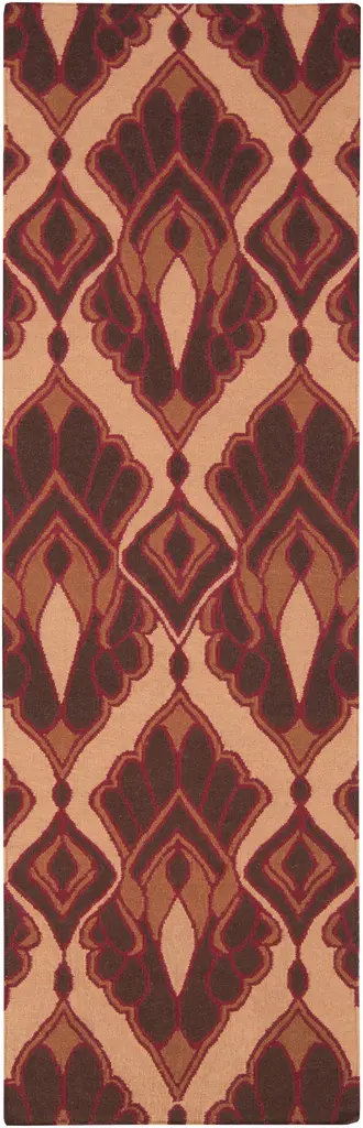 Collection: Wayne Colors: Burnt Orange, Dark Brown, Orange, Red Construction: Hand Woven Material: Face: 100% Wool Pile: No Pile Styles: Transitional,Bohemian Made In: India Thickness: 0.16" Price Range: $$$$$ (Affordable)