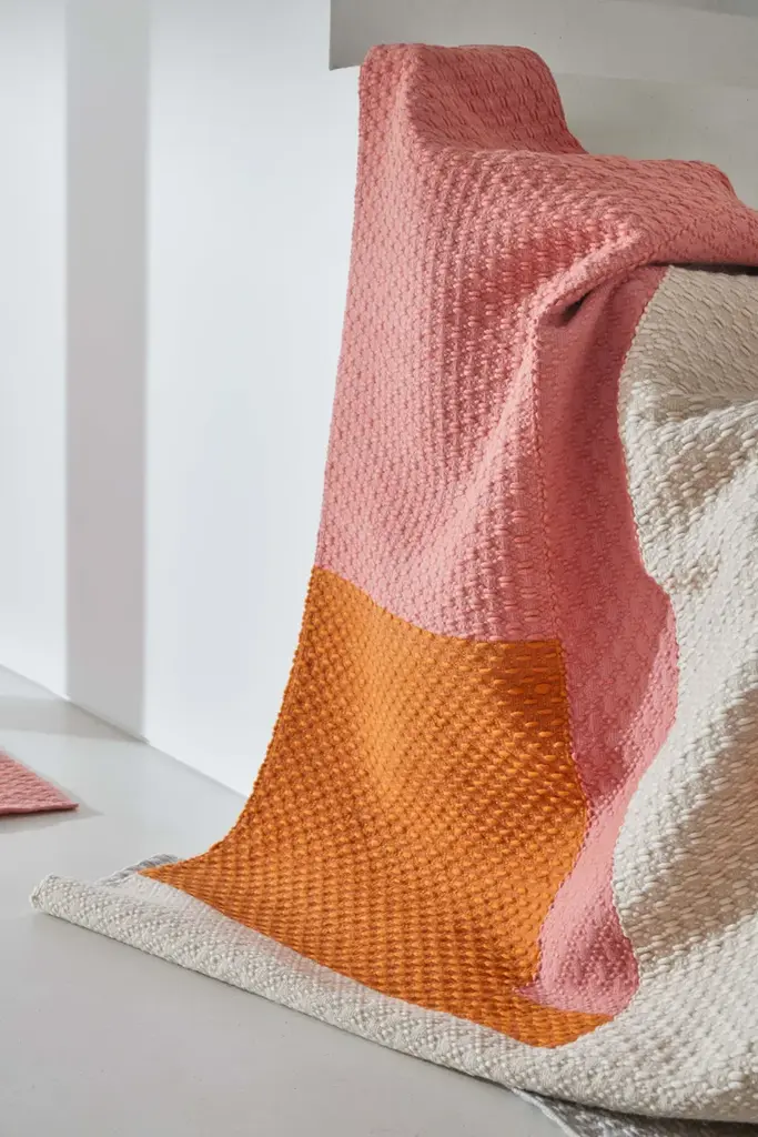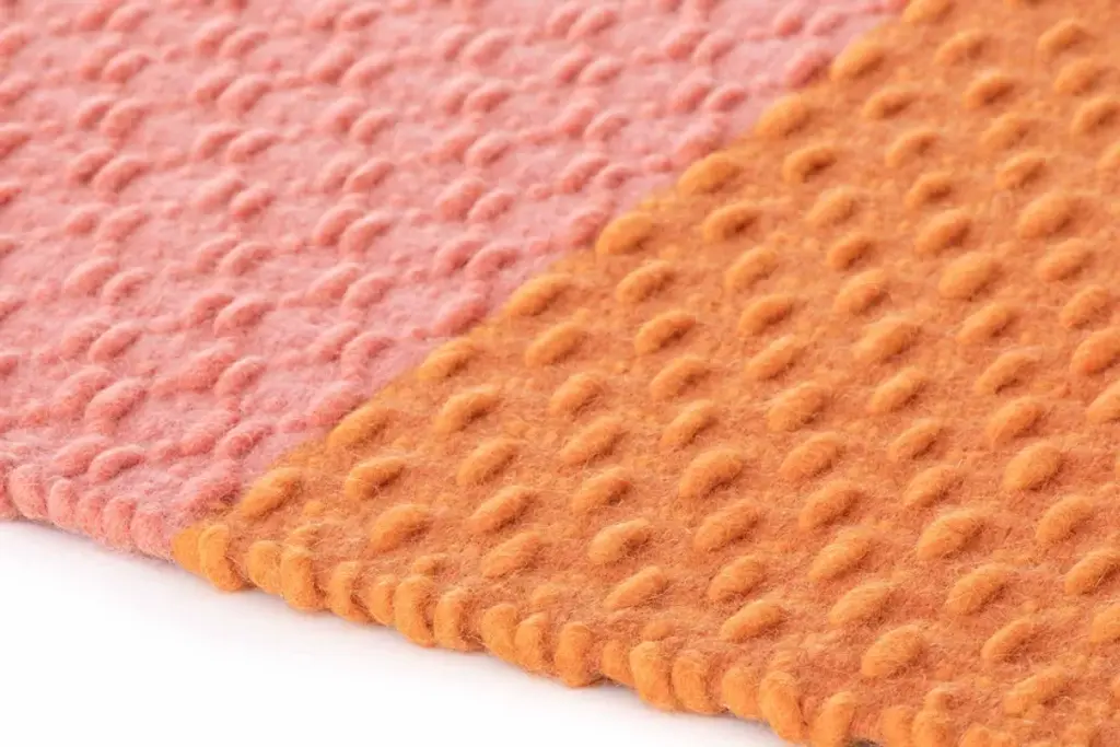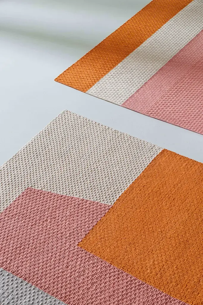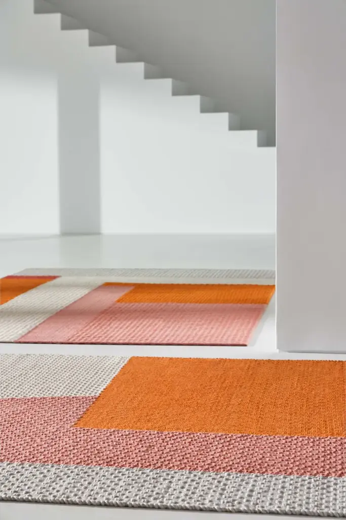 Nomad is a craftsmanship rug with 100% woolComposition:100% WoolTechnique:Hand LoomColours: OrangeBlends of textures, geometric patterns, vibrant and powdery colorsThe main inspiration in WEAVE is to highlight the different types of mathematical sequences that can becarried out on a handloom through a suggestive collage of textures and geometric patterns of clashingcolors. The shapes and colors of the rugs in the collection are arranged in the warp as if they were a workof abstract art. But it is worth examining each piece closely to discover that the weave at certain timesvaries, even within a single color block. This modifies its texture, bringing different depths to the colors,an effect that is difficult to achieve with other media.