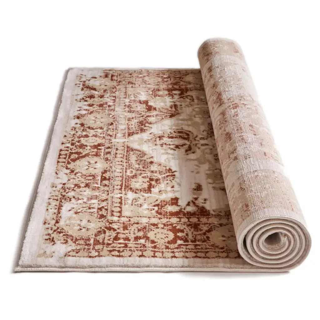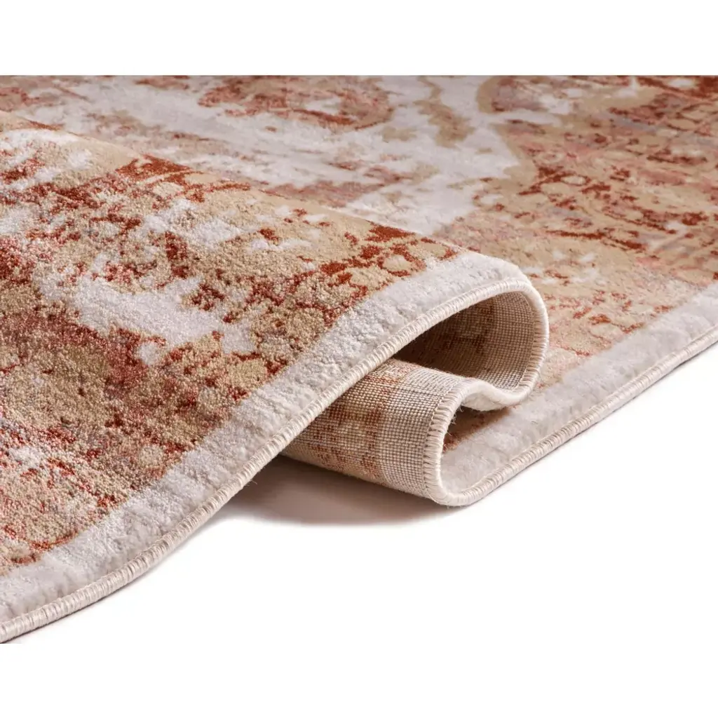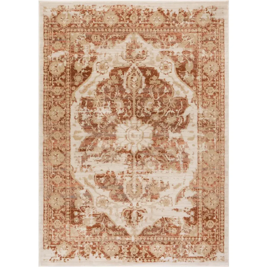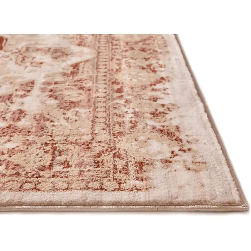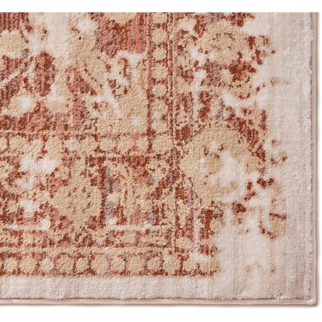Millie is a classic medallion design updated with a subtle, modern palette of copper red, coral pink, and dusty gold, offset by neutral ivory, beige, and grey. Soft, trendy colors and a detailed, floral pattern pair perfectly with an intentionally distressed brush effect for a rug that looks at the same time contemporary and antique. Fine, heat set olefin yarn gives a dense 0.4" pile that is soft, stain resistant, and doesn't shed or fade over time. The rug's 100% jute backing is safe for wood floors and all four sides of the rug are serged for improved durability.