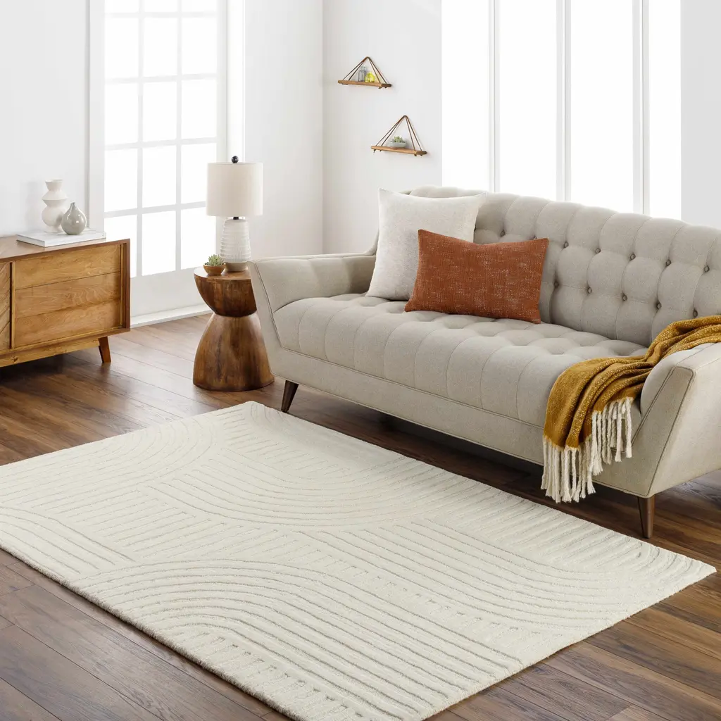 Collection: Whan Colors: Off White, Light Brown, Tan, Light Gray, Medium Gray Construction: Hand Tufted Material: 100% Wool Pile: Medium Pile Pile Height: 0.39" Styles: Contemporary Backing: Canvas Made In: India Thickness: 0.59" Price Range: $$$$$ (Affordable)