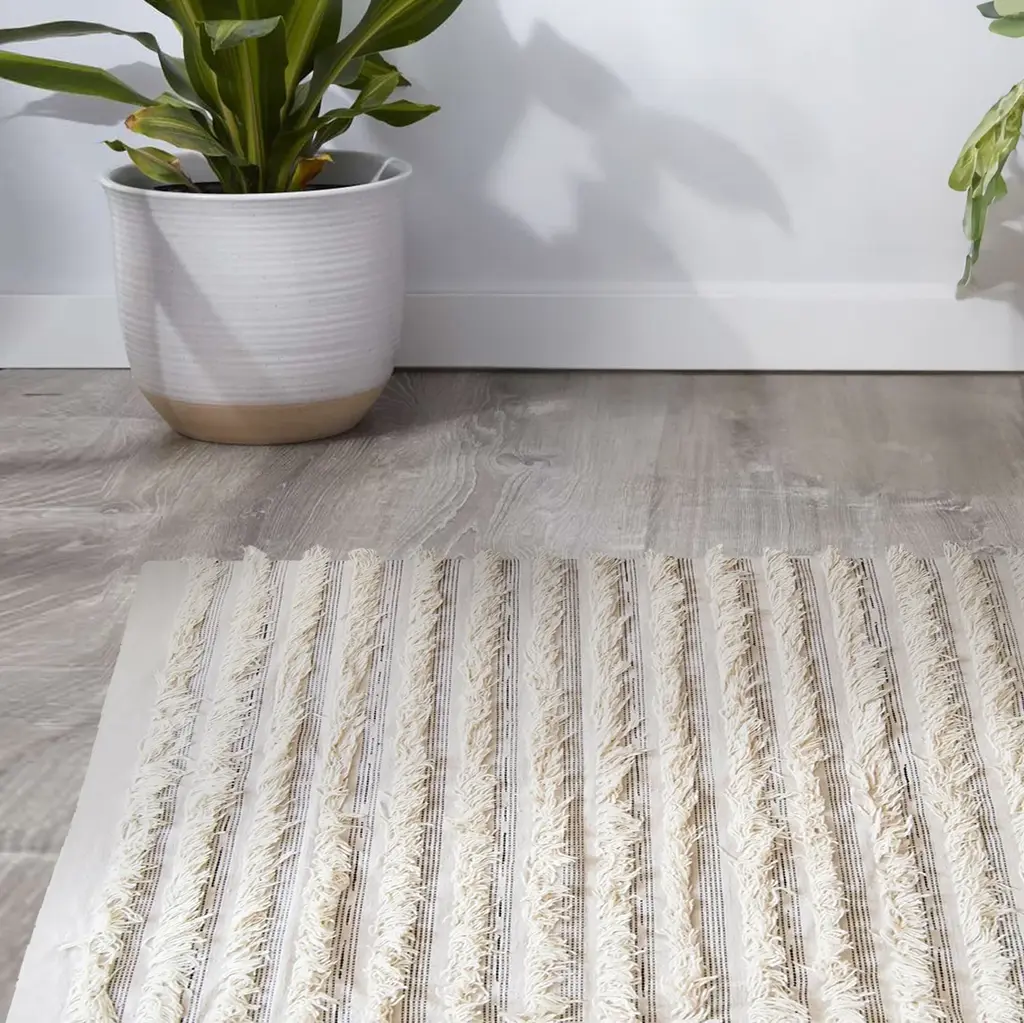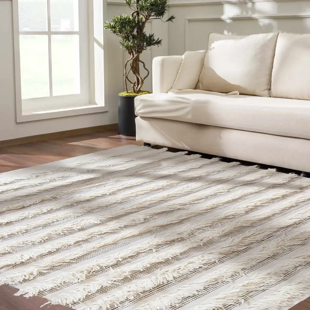 The White Area Rug is a blend of artisan craftsmanship and timeless design. The hand woven rug is crafted from quality wool in the Egyptian village of Fowwa. A finely textured base and intricate fringe detailing add depth and softness, while subtle dark stitching evokes classic Moroccan rug influences. Its soft ivory and cream colored rug tones make it a versatile fit for modern, bohemian, minimalist, coastal or mid century interiors. Whether styled as a white rug, boho rug, or tassel rug, it’s a sophisticated foundation for any room., Living room: use as a stylish boho area rug that anchors modern or farmhouse decor, Bedroom: Use as a cozy ivory rug alternative to a thick shag area rug , Entryway or hallway: add warmth to high traffic areas with this durable cream rug with tassels.