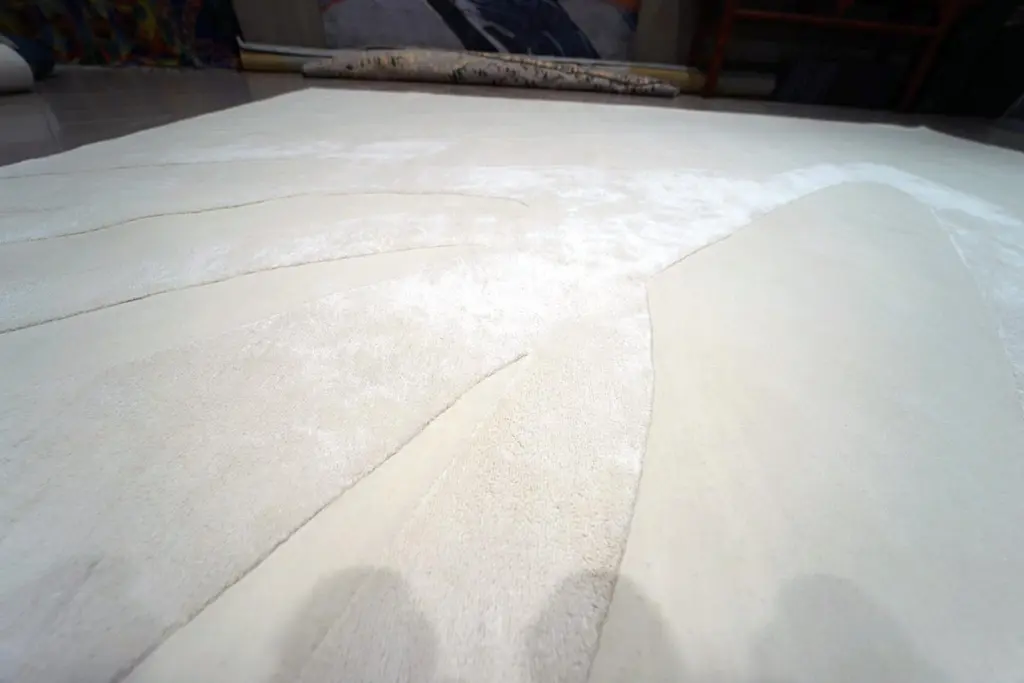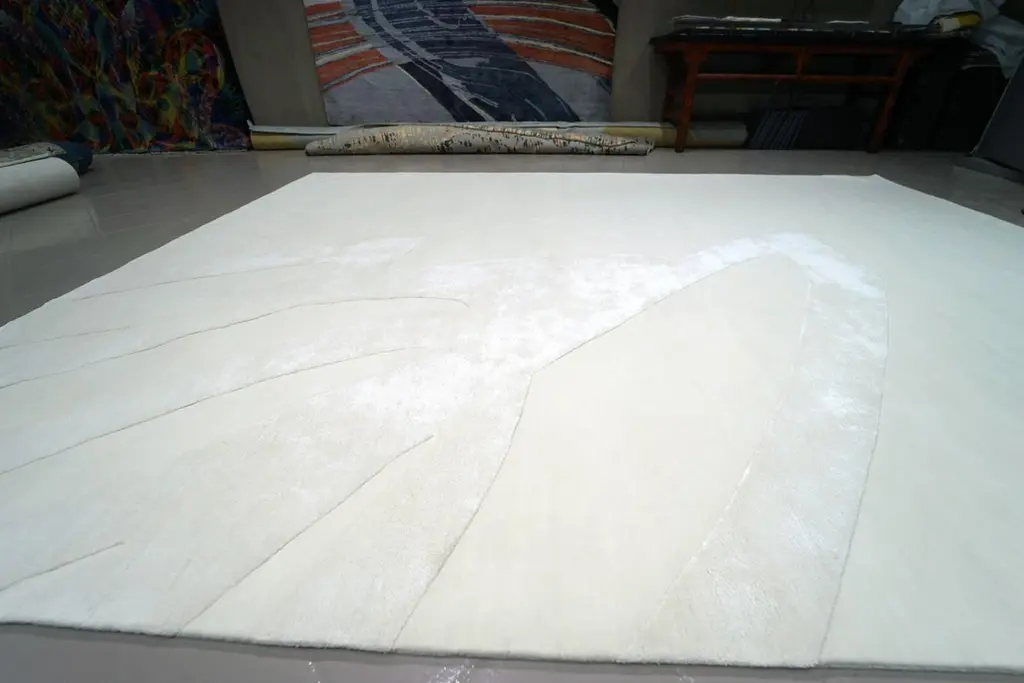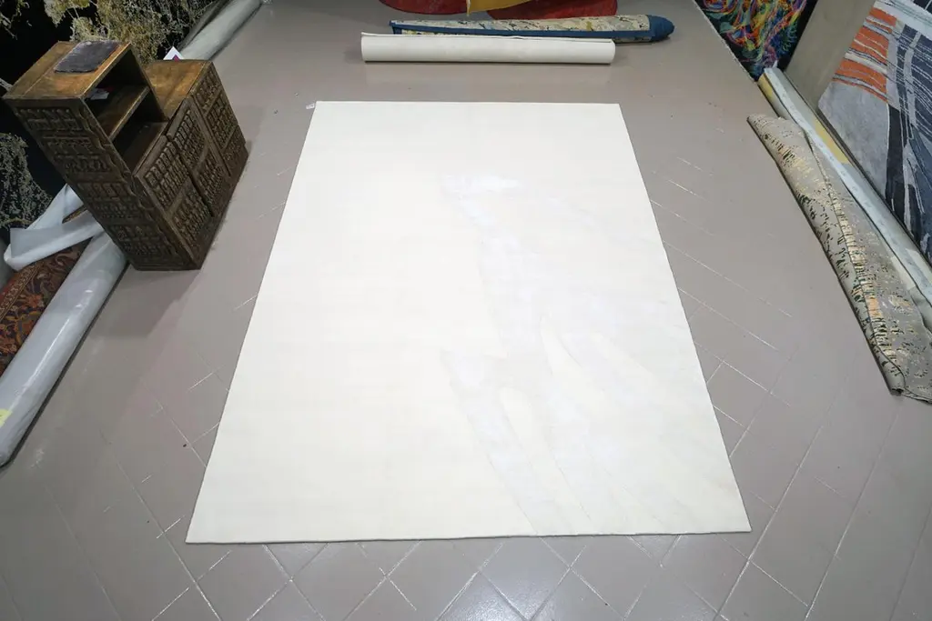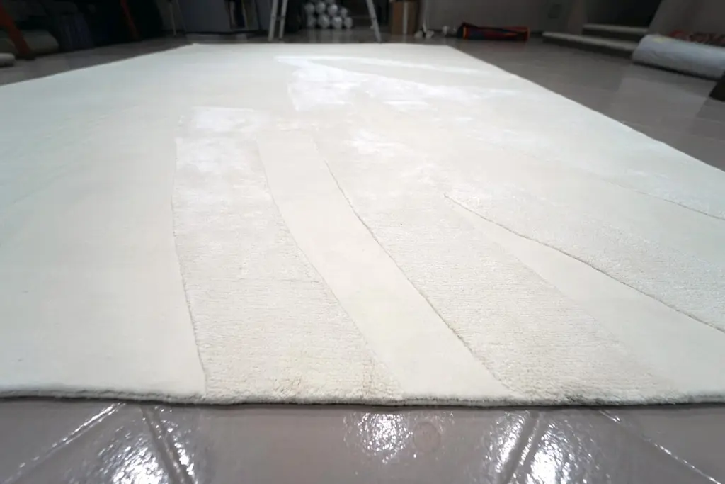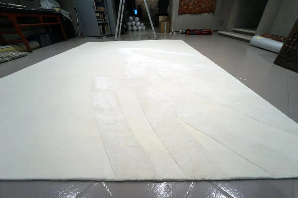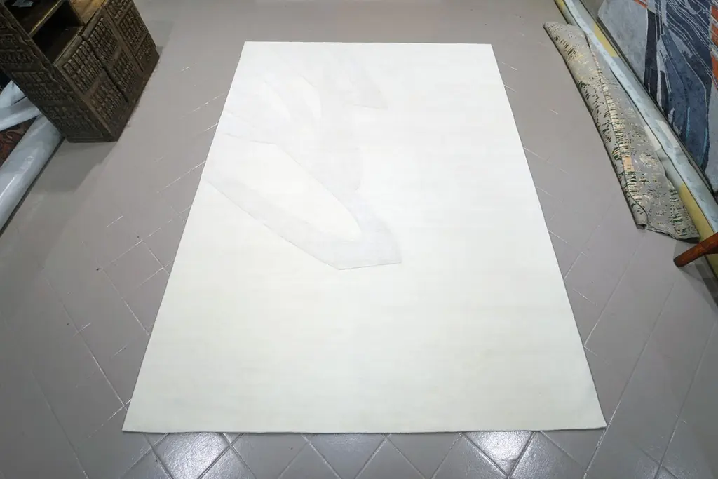 Beautiful, high quality rug in 100% New Zealand wool and pure silk, handknotted by our skilled Indian artisans.The rug 'Shadow', designed by Atelier Barberini & Gunnell, is made of over 150,000 knots/sqm. The abstract pattern is kept in white silk, while the background is in white New Zealand wool. For a better distinction of the pattern, the pile height between silk and wool is slightly different giving it a three-dimensional design. The original rug was designed to match our sculptural tables 'Bangles' or ' Chained up' by Atelier Barberini & Gunnell (you can find these artworks in our 1stdibs storefront). It is called 'Shadow' as it reflects the leg structure of the table as if it was its own shadow thrown on the flooring underneath.Dimensions: W 300 x L350 cm.Colors and dimensions are customizable. Leadtime: 4-5 months depending on the size. The artworks by Barberini & Gunnell are regularly shown at international art fairs, such as PAD London, PAD Genève, PAD Monaco, Salon Art and Design New York, Art Miami.The customer can choose from a color range of over 5000 different shades.We can exactly match the color of your environment, creating perfect color combinations for every space. All our yarns are hand-dyed on order, using only non-toxic and eco-friendly pigments.We have always loved experimenting and exploring the world of yarns. This has allowed us to be able to offer a truly wide range of incredible materials with different properties, shines and softness. Our rugs are handmade using the same techniques as ancient Persian rugs. In Nepal and India, places where carpet culture has resided for centuries, our expert craftsmen meticulously weave our creations.The history and culture behind a handmade carpet is infinite and every carpet is its direct consequence.