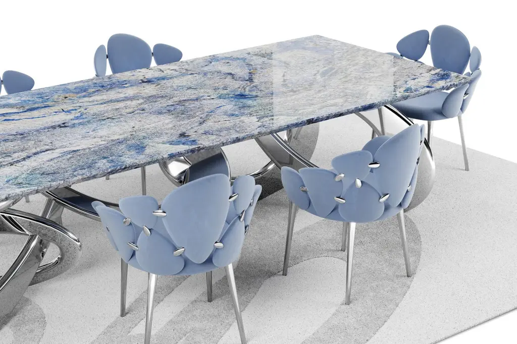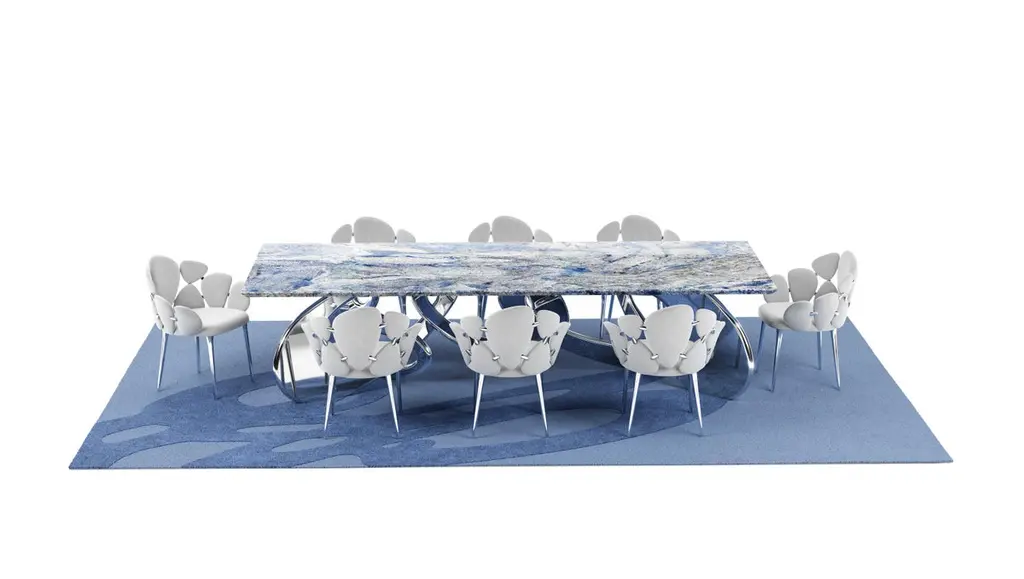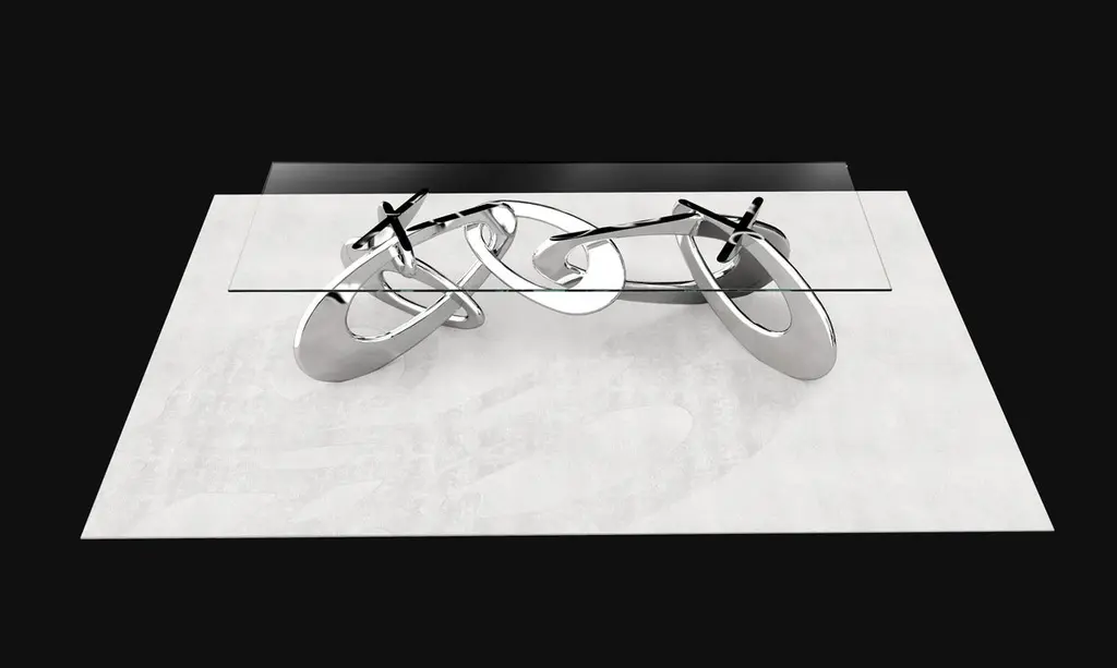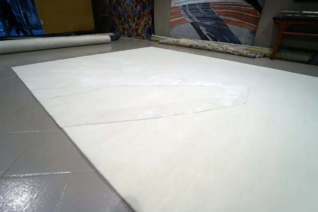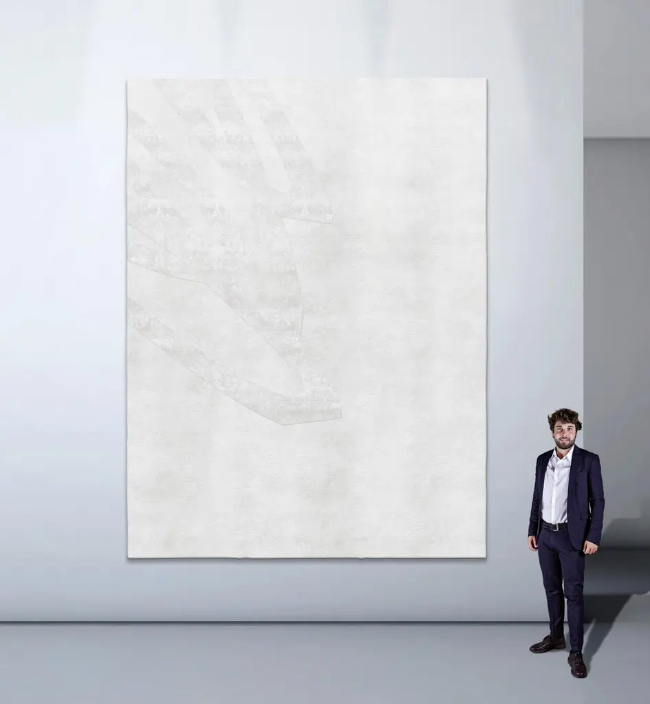 Beautiful, high quality rug in 100% New Zealand wool and pure silk, handknotted by our skilled Indian artisans.The rug 'Shadow', designed by Atelier Barberini & Gunnell, is made of over 150,000 knots/sqm. The abstract pattern is kept in white silk, while the background is in white New Zealand wool. For a better distinction of the pattern, the pile height between silk and wool is slightly different giving it a three-dimensional design. The original rug was designed to match our sculptural tables 'Bangles' or ' Chained up' by Atelier Barberini & Gunnell (you can find these artworks in our 1stdibs storefront). It is called 'Shadow' as it reflects the leg structure of the table as if it was its own shadow thrown on the flooring underneath.Dimensions: W 300 x L350 cm.Colors and dimensions are customizable. Leadtime: 4-5 months depending on the size. The artworks by Barberini & Gunnell are regularly shown at international art fairs, such as PAD London, PAD Genève, PAD Monaco, Salon Art and Design New York, Art Miami.The customer can choose from a color range of over 5000 different shades.We can exactly match the color of your environment, creating perfect color combinations for every space. All our yarns are hand-dyed on order, using only non-toxic and eco-friendly pigments.We have always loved experimenting and exploring the world of yarns. This has allowed us to be able to offer a truly wide range of incredible materials with different properties, shines and softness. Our rugs are handmade using the same techniques as ancient Persian rugs. In Nepal and India, places where carpet culture has resided for centuries, our expert craftsmen meticulously weave our creations.The history and culture behind a handmade carpet is infinite and every carpet is its direct consequence.