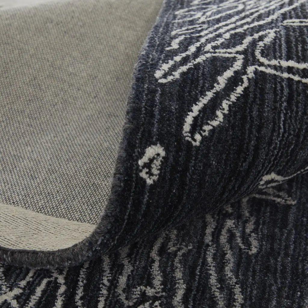 Collection: Whitton Colors: Black, Gray, Ivory Construction: Hand Woven Material: Face: Viscose, Wool / Warp: Cotton Pile: Low Pile Pile Height: 0.5" Styles: Contemporary,Industrial Backing: Cotton Made In: India Thickness: 0.5" Price Range: $$$$$ (Premium)
