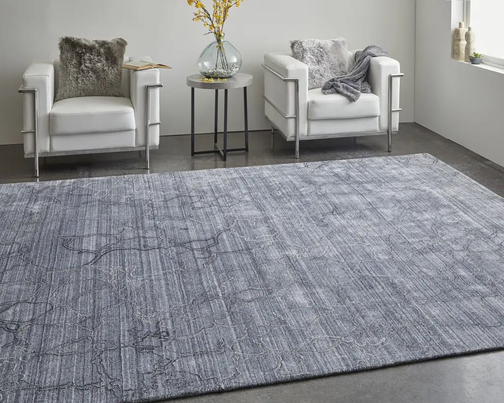 Collection: Whitton Colors: Gray, Blue Construction: Hand Woven Material: Face: Viscose, Wool / Warp: Cotton Pile: Low Pile Pile Height: 0.5" Styles: Contemporary,Industrial,Casual Backing: Cotton Made In: India Thickness: 0.5" Price Range: $$$$$ (Premium)