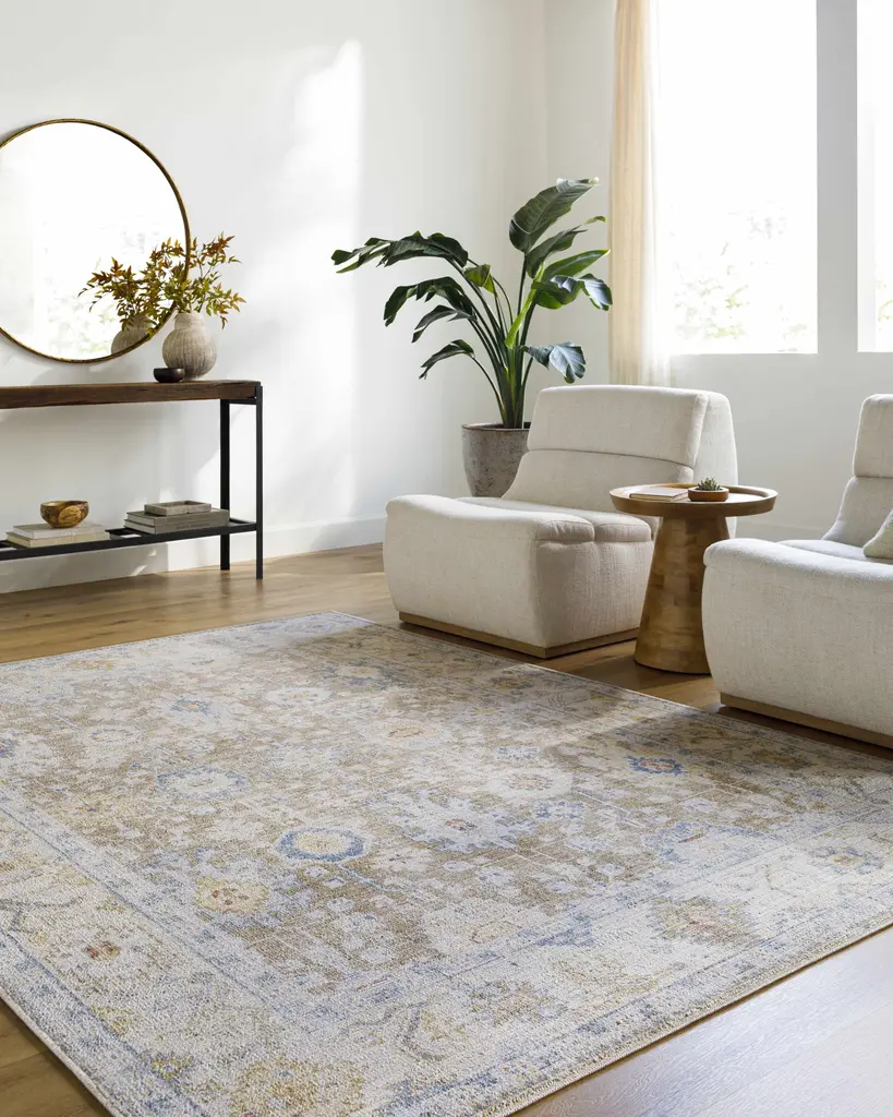 Collection: Widad Colors: Mustard, Beige, Denim, Peach, DarkBlue, LightGray Construction: Machine Woven Material: 100% Polyester Pile: Medium Pile Pile Height: 0.31" Styles: Traditional Made In: Turkey Thickness: 0.39" Price Range: $$$$$ (Affordable)