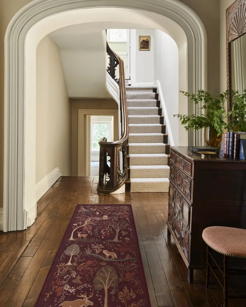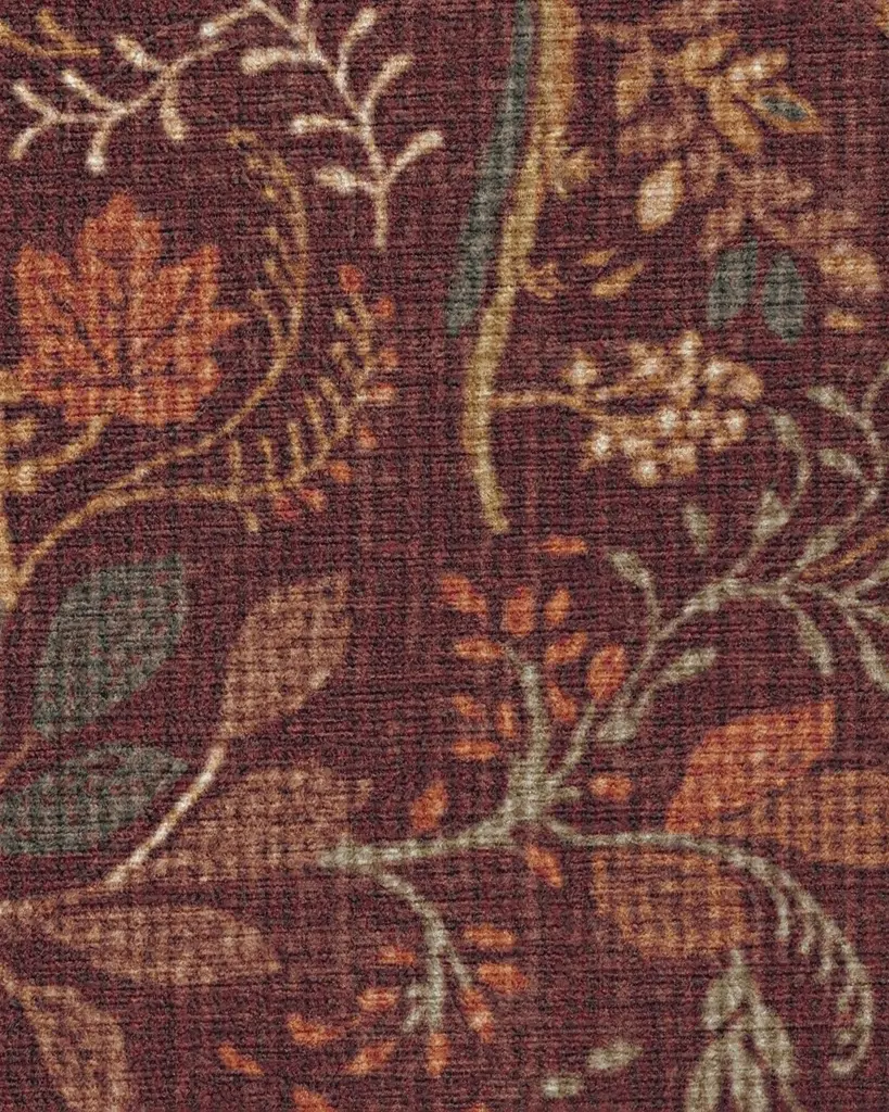 Refresh your space for autumn with our Wilder Burgundy Multicolor Rug. This whimsical design depicts a woodland landscape where animals roam amidst falling leaves and tall trees. The fall palette features soft sages, browns, coppers, neutrals, and greens, complemented by accents of light cream—all set against a rich burgundy background. Water-resistant, stain-resistant, and machine-washable. Rug colors may vary slightly according to your device and the lighting in your space.