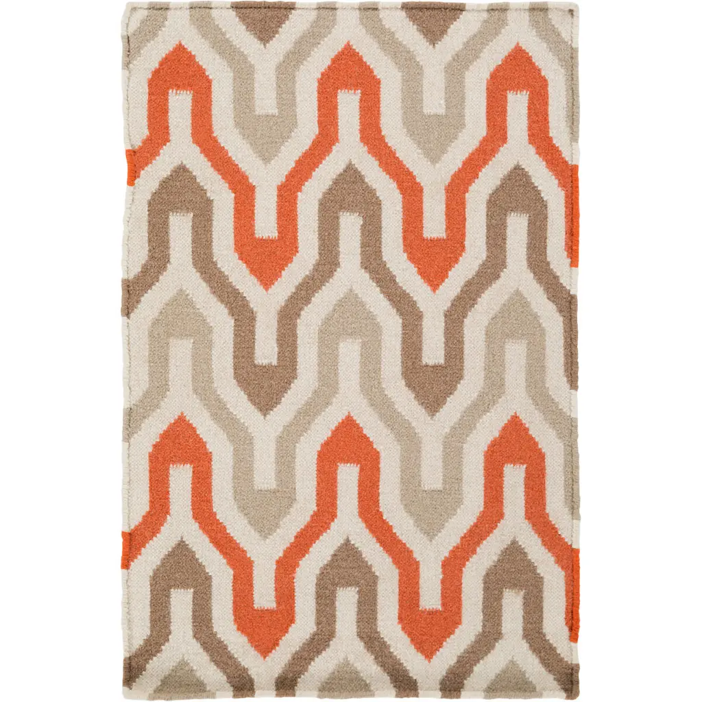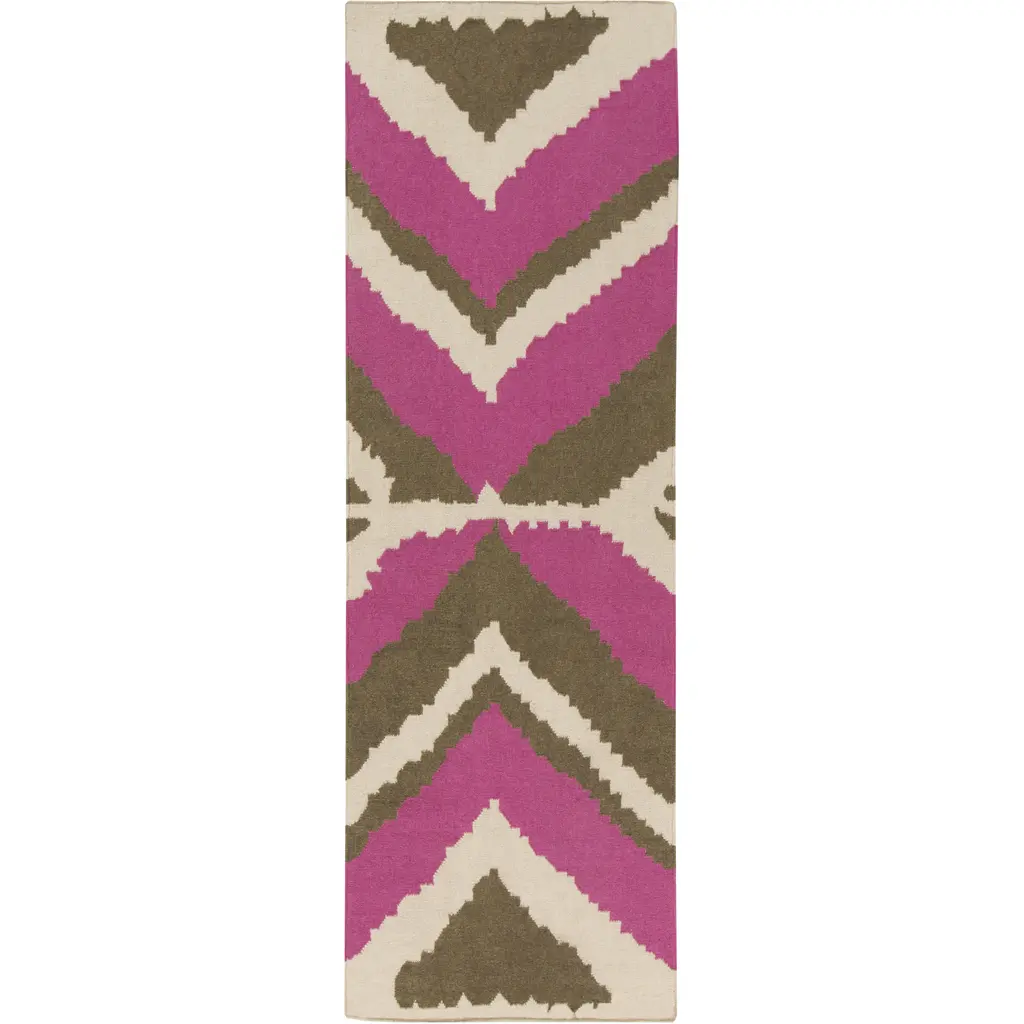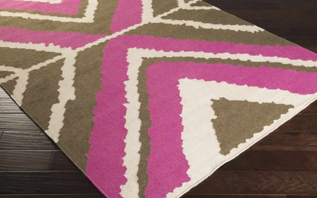 Collection: Wiley Colors: Dark Brown, Fuchsia, Peach Construction: Hand Woven Material: 100% Wool Pile: No Pile Styles: Transitional,Bohemian Made In: India Thickness: 0.16" Price Range: $$$$$ (Affordable)