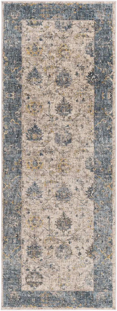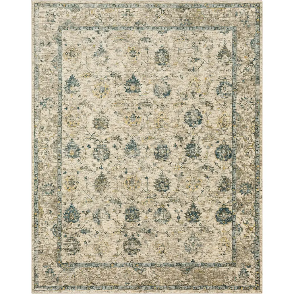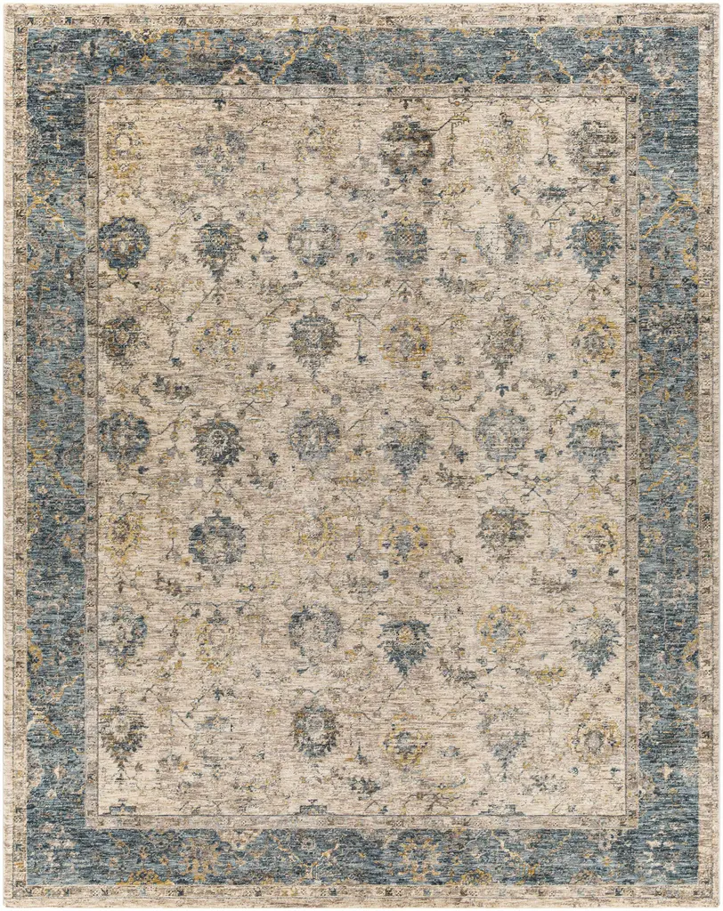 Collection: Wilkie Colors: Mustard, Teal, Tan, PaleBlue, MediumGray, LightGray Construction: Machine Woven Material: 100% Polyester Pile: Medium Pile Pile Height: 0.35" Styles: Traditional Made In: Turkey Thickness: 0.43" Fringe Length: 0.6" Price Range: $$$$$ (Affordable)