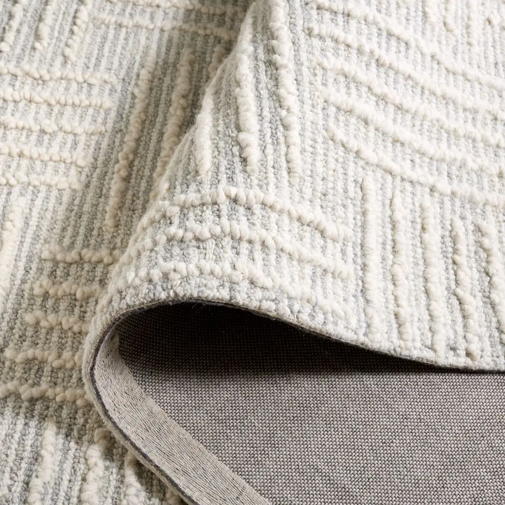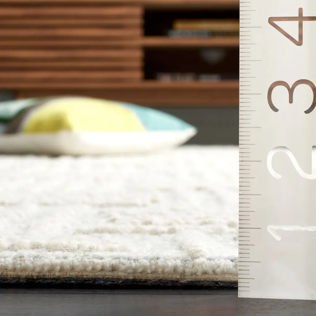 Introducing our exquisite Hand Tufted Small Rectangle Area Rug, an embodiment of sophistication and durability. Measuring 3 feet by 5 feet and boasting a comfortable height of 1/4 inch, this area rug is perfect for accentuating any space in your home. Crafted with an 80% wool and 20% cotton blend, our rug promises a luxurious feel underfoot while ensuring longevity. The wool provides a soft, plush texture, while the cotton adds strength and breathability, making this rug an ideal choice for your living space, bedroom, or study. The light grey and ivory colors of the rug are beautifully woven into a contemporary geometric pattern, as illustrated in the image. The subtle contrasts between the hues create a soothing aesthetic that complements a wide range of interior designs, from modern minimalist to rustic charm. This small rectangular rug is hand-tufted by skilled artisans in India, a testament to its quality and the rich heritage of traditional rug-making. The hand-tufting technique lends the rug a unique character with slight variations that make each piece one-of-a-kind. Elevate your home decor with this stylish, chic rug that seamlessly blends functionality with artistic flair. Whether you're looking to add a touch of elegance to your entryway or provide a soft spot for your feet next to the bed, this versatile area rug is the perfect choice.