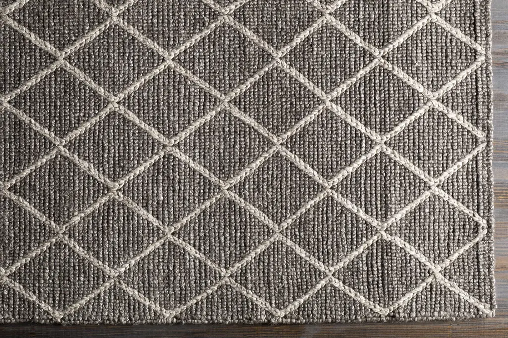 Collection: Wilmore Colors: Charcoal, Medium Gray Construction: Hand Woven Material: 50% Viscose, 50% Wool Pile: No Pile Styles: Contemporary Made In: India Thickness: 0.08" Price Range: $$$$$ (Affordable)