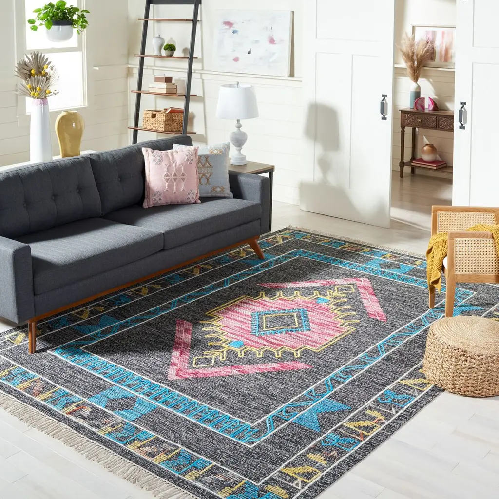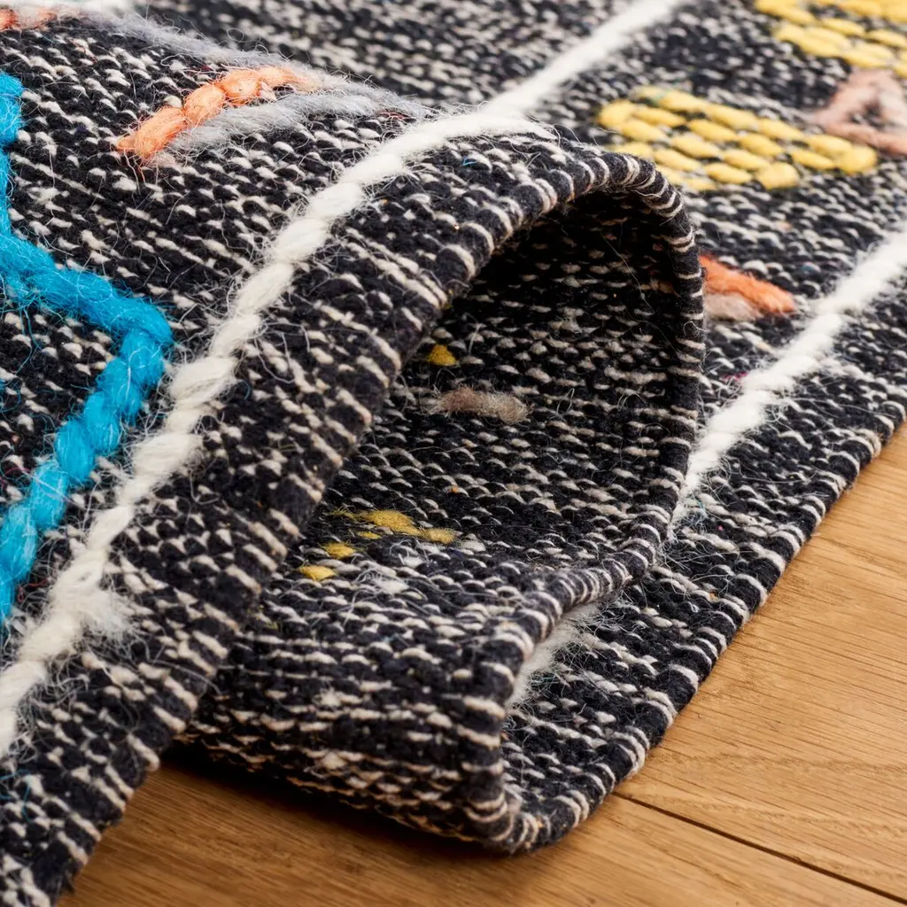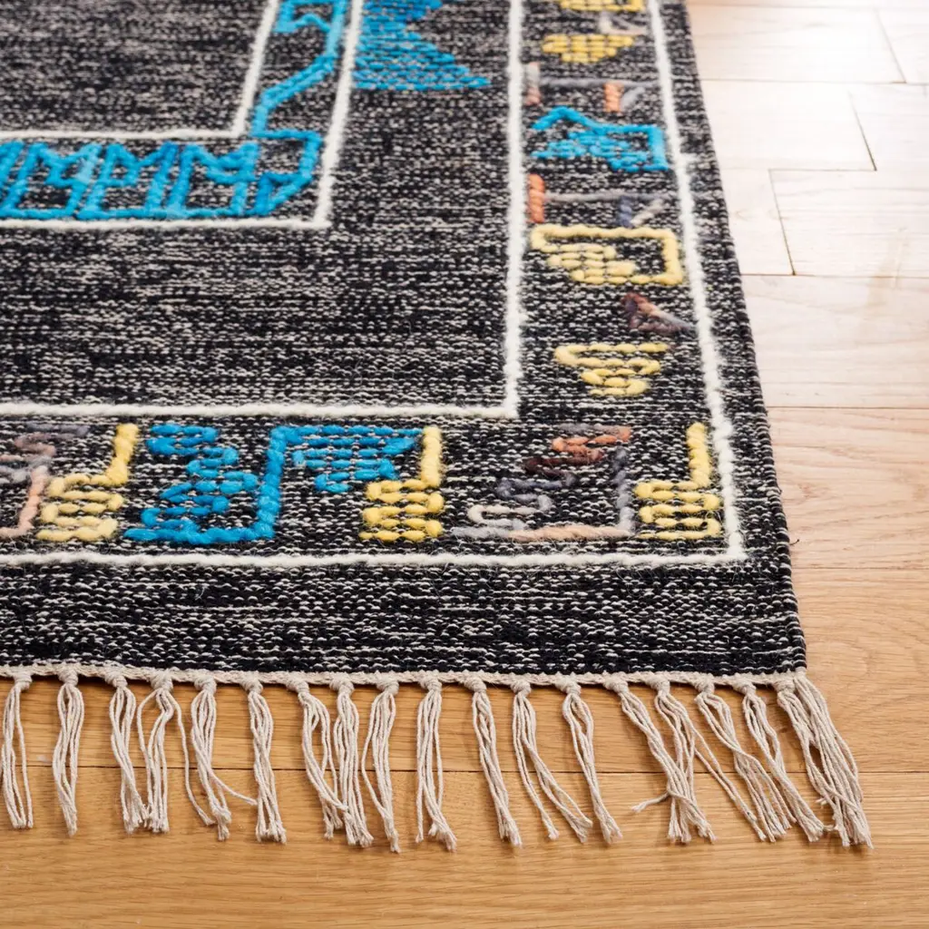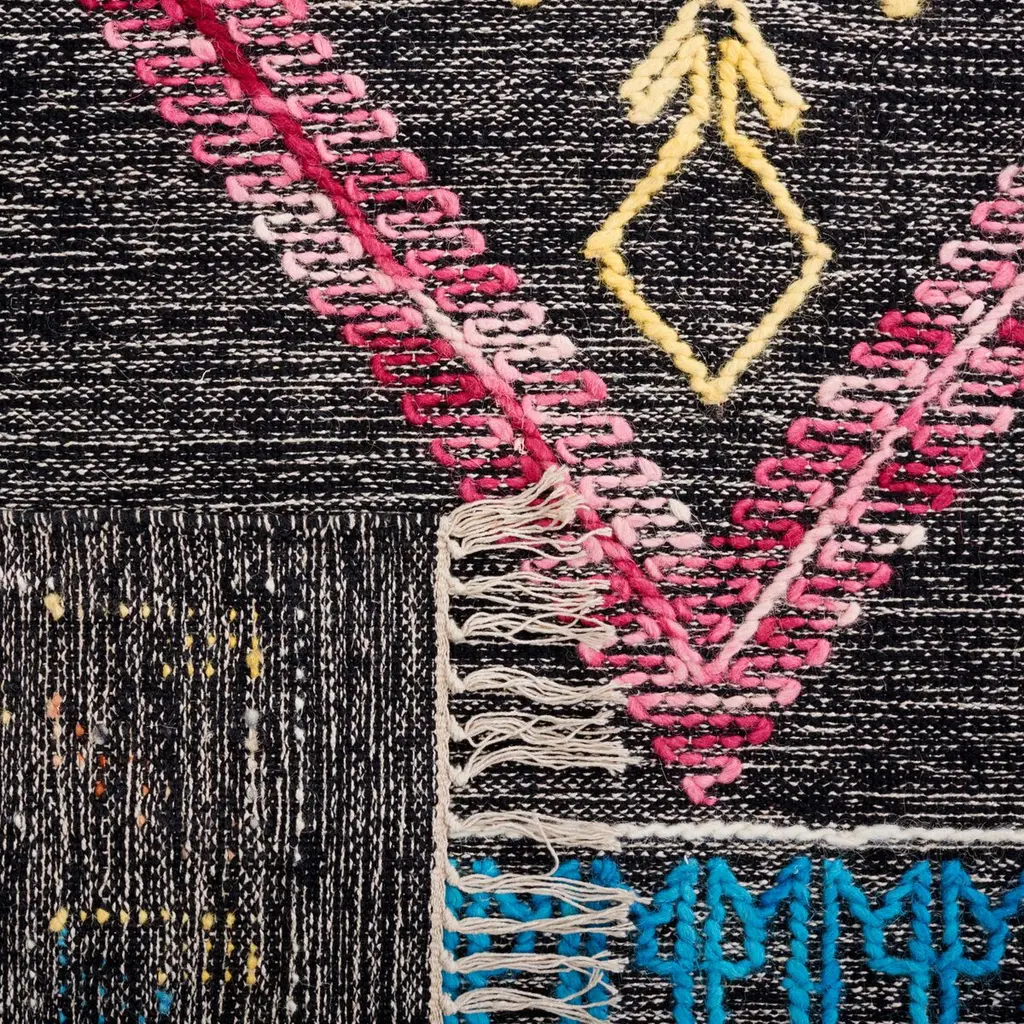 Enhance the aesthetic of your living space with this exquisite handcrafted area rug. Measuring 4' X 6', this small rectangular rug is a marvel of Indian craftsmanship, featuring a flat weave construction with a pile height of 3/8". Made entirely from luxurious wool, it promises durability and supreme softness that can only be achieved through the skillful hands of Indian artisans. The rug's design encapsulates a Bohemian spirit, making it an ideal choice for those who cherish eclectic and vibrant home d?cor. Its bold black base sets the stage for a captivating pattern that unfolds in vivid pink and complementary teal, with hints of understated neutrals that bring balance and harmony. The rug's pattern, as seen in the image, boasts a symmetrical central motif reminiscent of traditional tribal art, bordered by intricate detailing that adds depth and texture. The striking contrast of pink against the black background creates a focal point that is both eye-catching and warmly inviting. Perfect for any room that requires a touch of sophistication, this rug will serve as a conversation starter and a testament to your taste for the unconventional. Not only is it a testament to artistic expression, but it also adds a layer of comfort and warmth to your flooring. Experience the blend of tradition and modernity with this stunning Bohemian-style area rug, a treasure made in India that is sure to elevate your interior decor to new heights.
