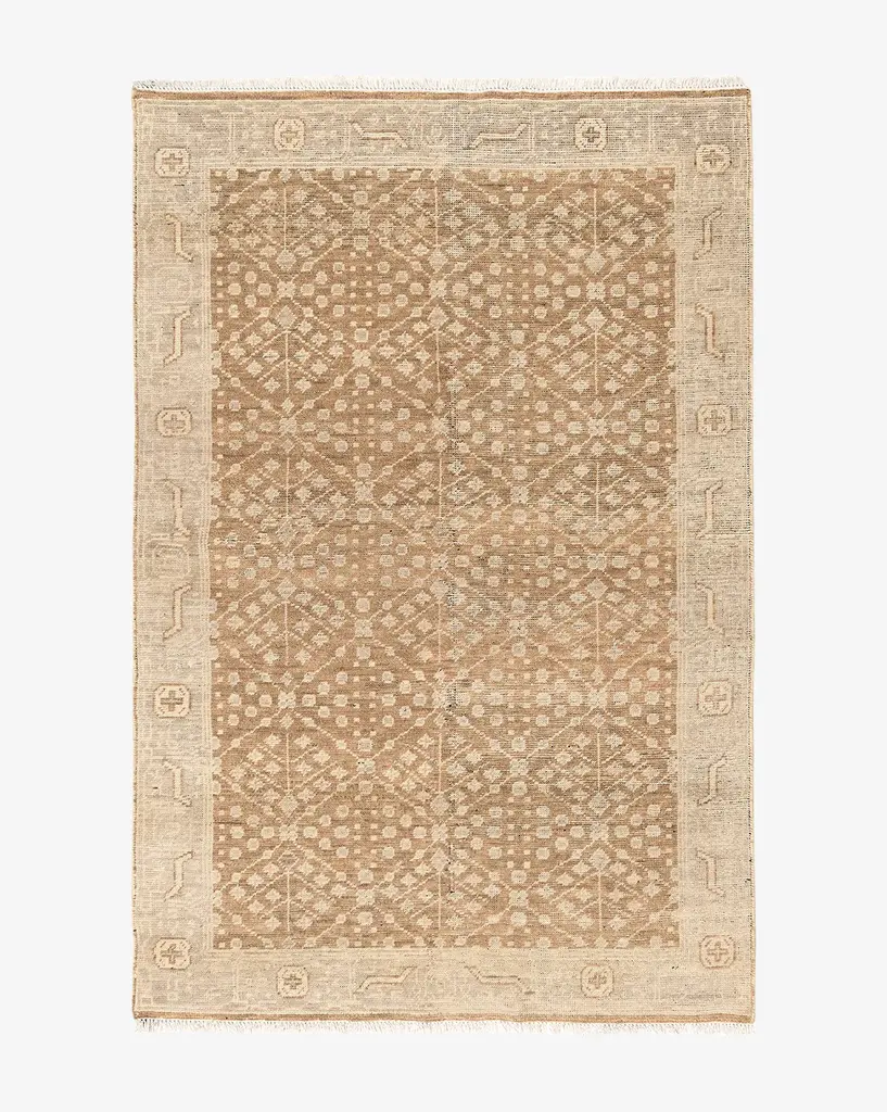 Ornate yet sophisticated, our Windsor Hand-Knotted Rug features a detailed pattern wrapped in an intricate border. The neutral-toned frame provides a beautiful contrast that highlights the rust-coloring and rich warmth of the central motif. Crafted with wool and hand-knotted by skilled artisans, it adds a layer of dimension and enduring elegance to your space.