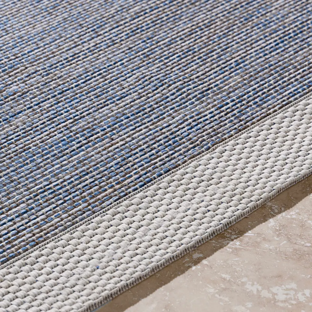 Collection: Wishon Colors: Taupe, Cream, Blue Construction: Machine Woven Material: 100% Polypropylene Pile: No Pile Styles: Contemporary Outdoor Safe: Yes Made In: Belgium Thickness: 0.15" Price Range: $$$$$ (Most Affordable)