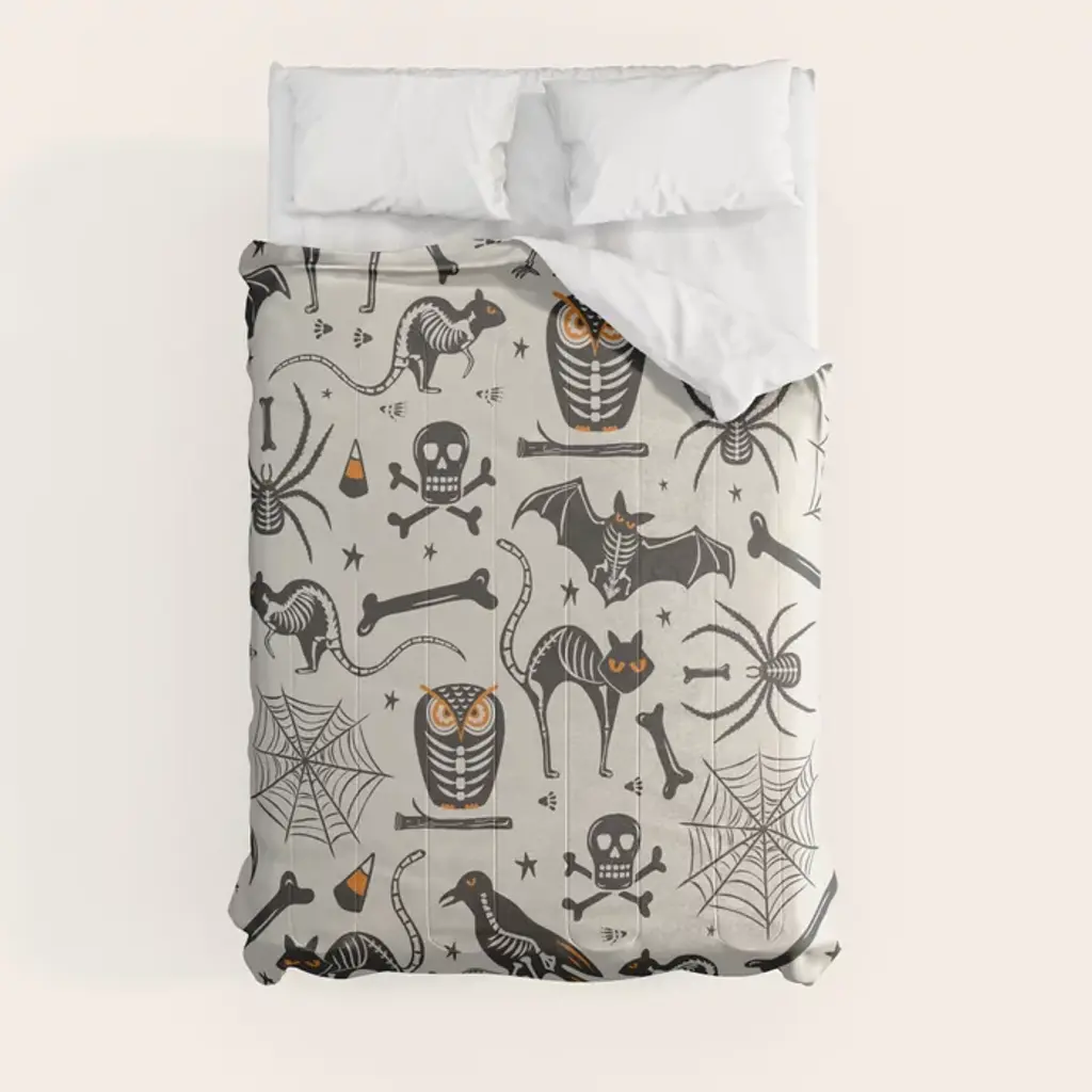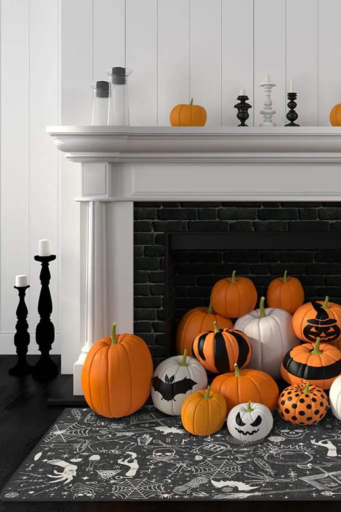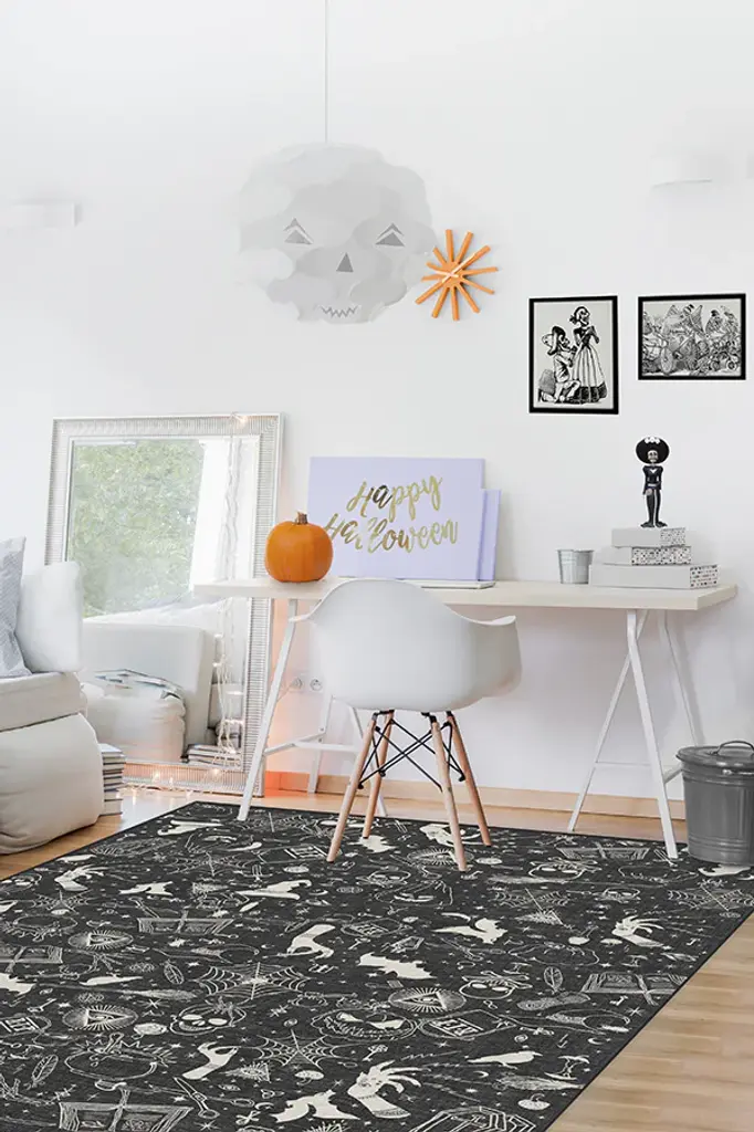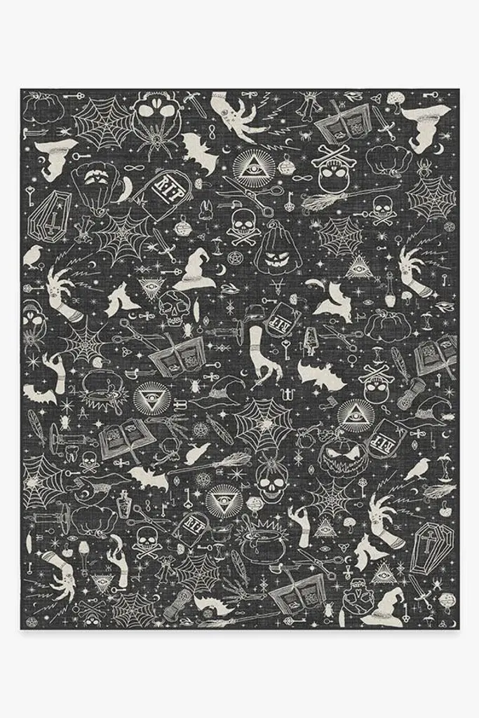 Cast a decorative spell on your home this Halloween with our wondrous Witchcraft Rug. The potpourri collage of pumpkins, skulls, spiderwebs, and other sorceress sundries and symbols is hand-drawn in ivory over a mysterious background of gunmetal, fog, and grey. Double, double the toil and trouble of any room in your home with this enchanting holiday accent piece. Water-resistant, stain-resistant, and machine-washable.
