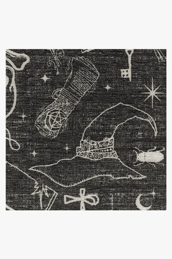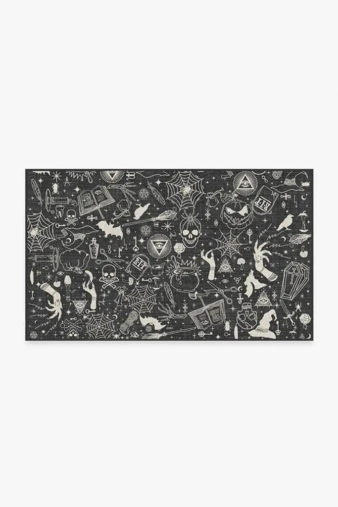 Cast a decorative spell on your home this Halloween with our wondrous Witchcraft Rug. The potpourri collage of pumpkins, skulls, spiderwebs, and other sorceress sundries and symbols is hand-drawn in ivory over a mysterious background of gunmetal, fog, and grey. Double, double the toil and trouble of any room in your home with this enchanting holiday accent piece.