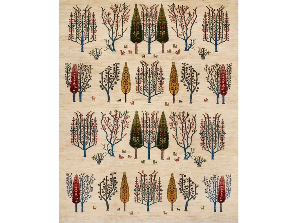 Woodland at Sunset is a rectangular wool rug.Zollanvari Super Fine Gabbeh.Bulurbaft, the most ‘classical’ design carpets, are woven in the province of Kurdistan. ‘Bulur’ is Farsi for ‘brilliant’ or ‘precise’, an apt definition for these finely woven carpets that are similar to traditional Bijar carpets in quality and weave. The designs draw inspiration from old Senneh carpets, but refreshed and updated the colour palette to suit modern sensibilities. The Luribaft carpets are knotted by Luri tribesmen or by Ghashgha’i women married into the tribe. The designs are passed down from generation to generation or are recreated using ancient Luri ornaments as templates, since some archaic motifs had vanished from their repertoire. Until the 1950s the Luri tribes worked exclusively with vegetable dyes. The emergence of chemical dyes, mainly from Germany, made it easier to dye wool, but led to a loss of the intrinsic character of these fine carpets. In the 1980s Zollanvari forced a return to the ancient vegetable dyeing techniques and thereby revived the allure of these carpets.