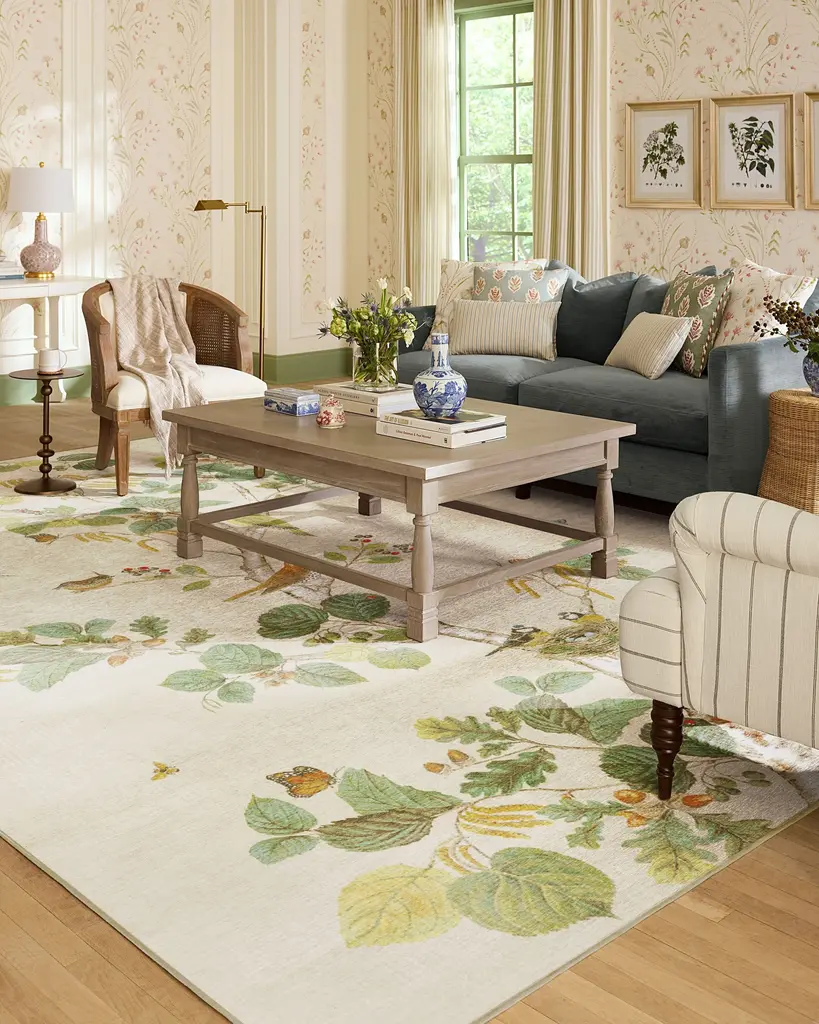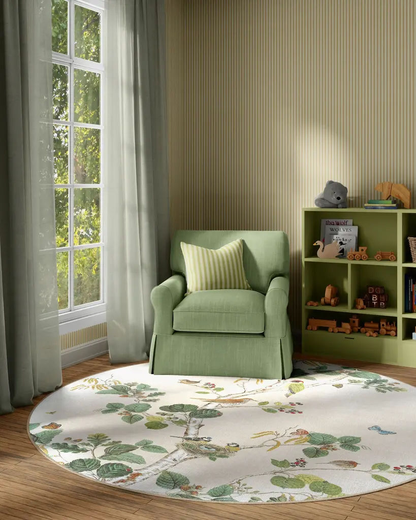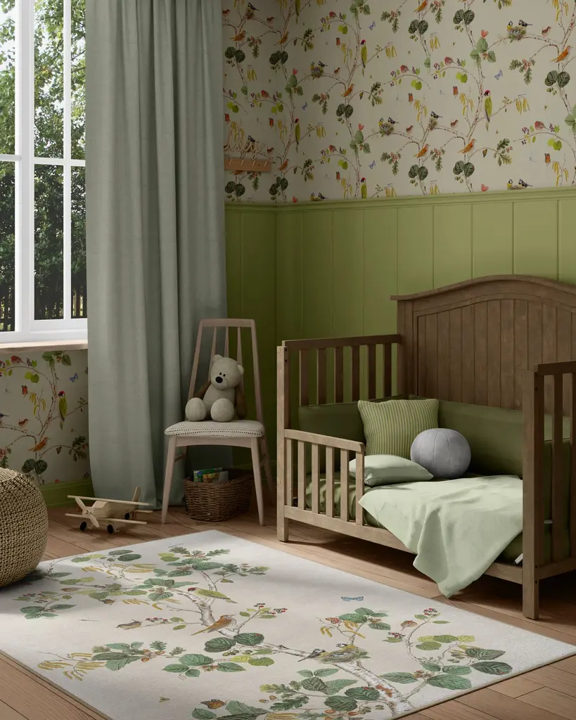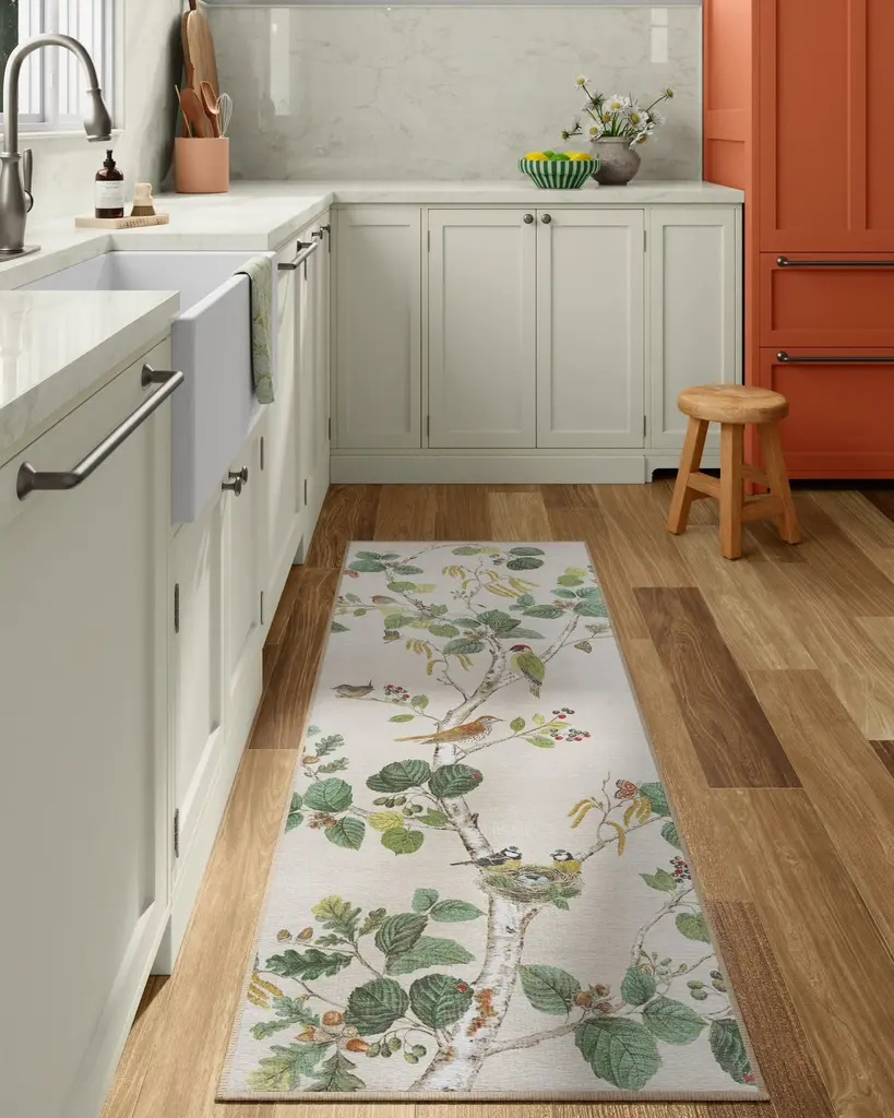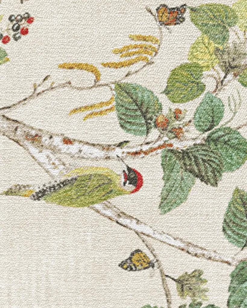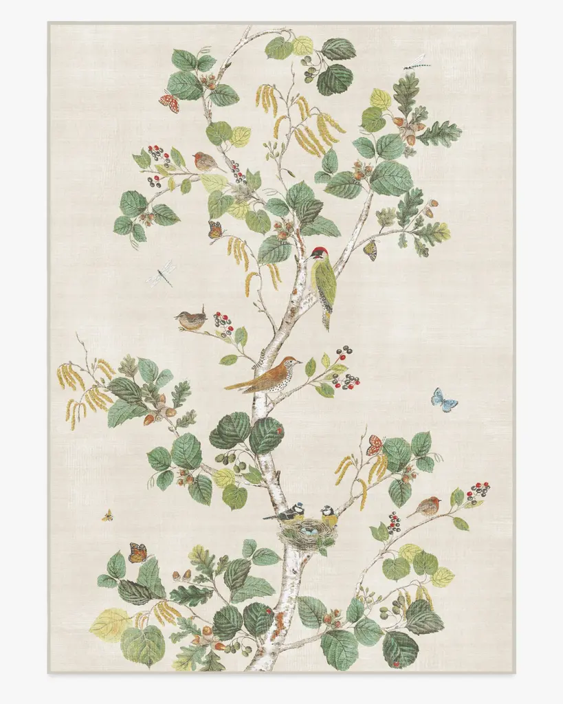 Referencing Woodland Chorus, a Sanderson design inspired by an 18th-century botanical painting, our Sanderson Woodland Chorus Fawn Rug features a variety of birds—woodpeckers, wrens, robins, thrushes, and blue tits. Butterflies, insects, ladybirds, and various woodland berries embellish the branches, adding extra life and movement to the design. A palette of natural greens, browns, taupes, yellows, oranges, and reds, set against a beige background, helps create a nature-inspired aesthetic. Water-resistant, stain-resistant, and machine-washable. Rug colors may vary slightly according to your device and the lighting in your space.