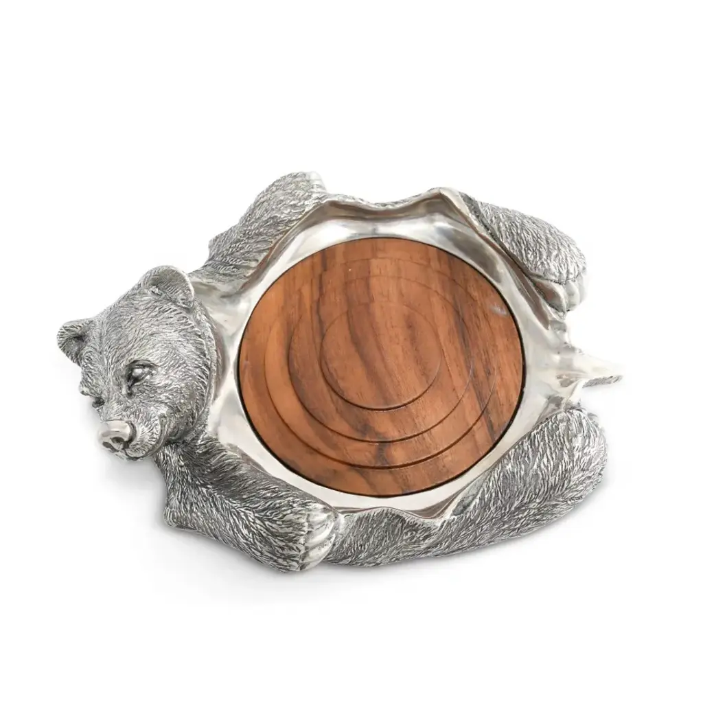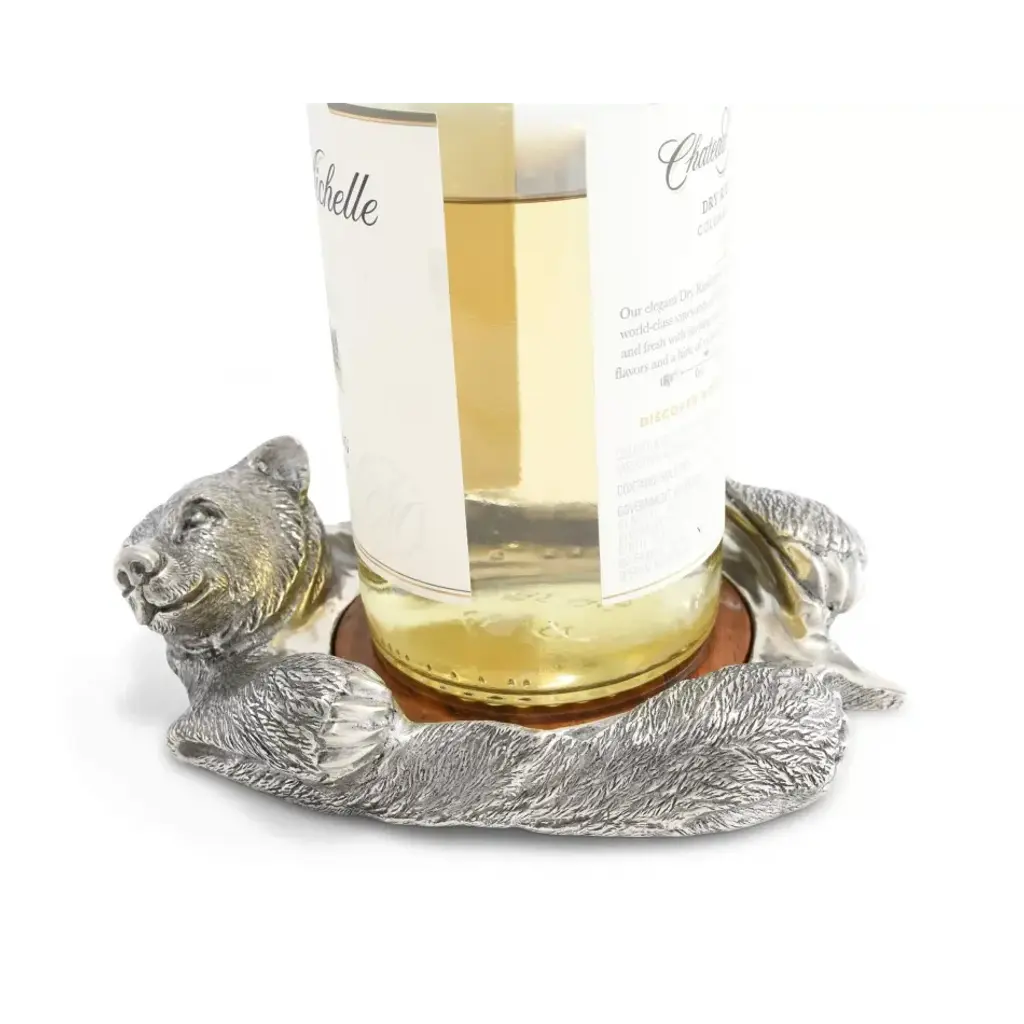 Coast your wine bottle on our truly unique, exquisitely crafted pewter and cherry Mighty Bear Rug wine coaster. Created from durable, water resistant cherry wood and pure Vagabond House pewter, this coaster makes a wonderful gift for bear lovers of all types. Vagabond House is a family-owned American company specializing in fine pewter tableware, servingware and giftware. Largely inspired by nature, their exclusive products are designed to be unique, functional heirlooms for those who seek to express tradition and style in both family and formal entertaining.