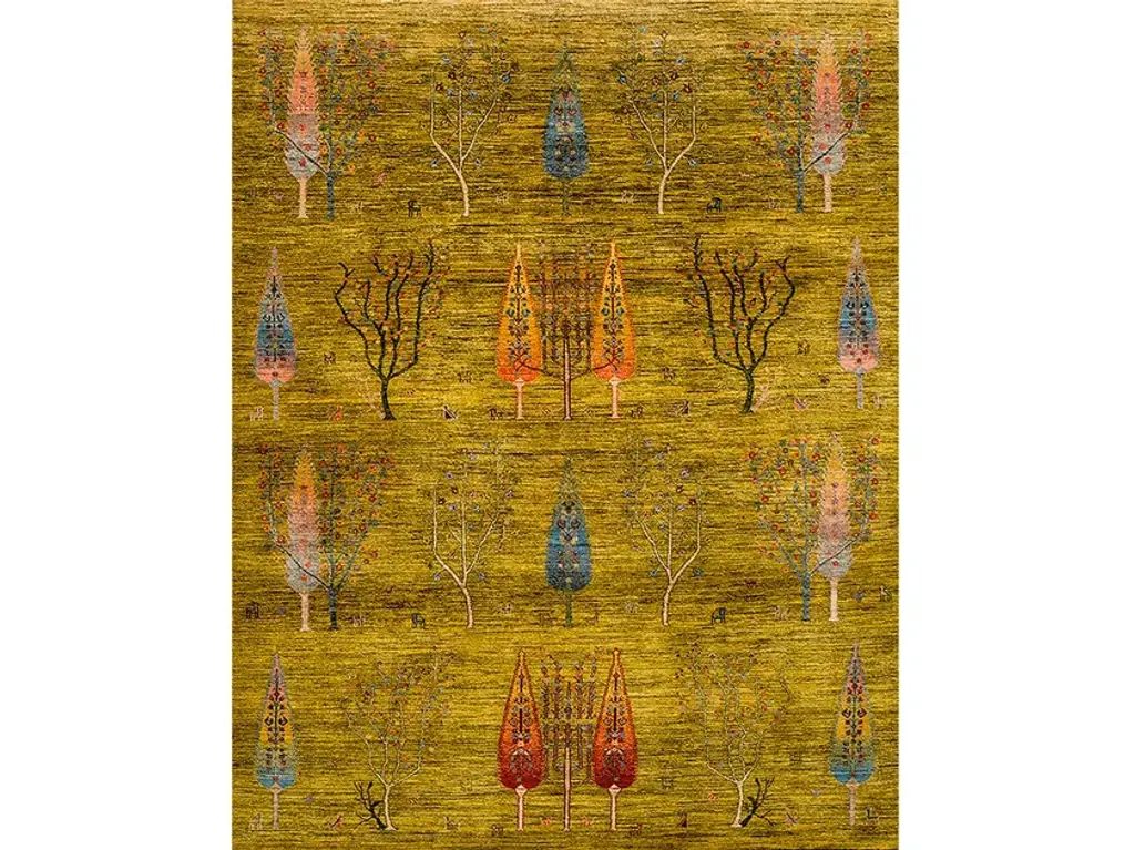 Woodland on Squares Revisited is a rectangular wool rug.Zollanvari Super Fine Gabbeh.Bulurbaft, the most ‘classical’ design carpets, are woven in the province of Kurdistan. ‘Bulur’ is Farsi for ‘brilliant’ or ‘precise’, an apt definition for these finely woven carpets that are similar to traditional Bijar carpets in quality and weave. The designs draw inspiration from old Senneh carpets, but refreshed and updated the colour palette to suit modern sensibilities. The Luribaft carpets are knotted by Luri tribesmen or by Ghashgha’i women married into the tribe. The designs are passed down from generation to generation or are recreated using ancient Luri ornaments as templates, since some archaic motifs had vanished from their repertoire. Until the 1950s the Luri tribes worked exclusively with vegetable dyes. The emergence of chemical dyes, mainly from Germany, made it easier to dye wool, but led to a loss of the intrinsic character of these fine carpets. In the 1980s Zollanvari forced a return to the ancient vegetable dyeing techniques and thereby revived the allure of these carpets.