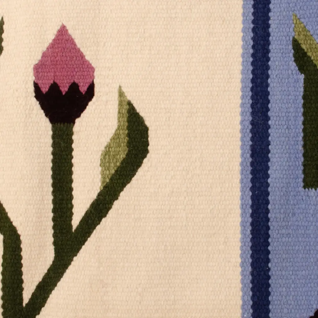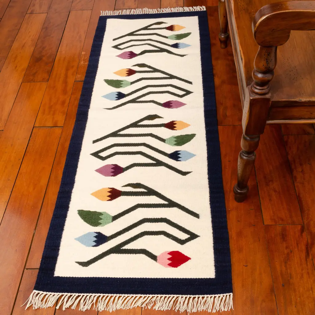 Abstract line defines a bouquet of tulips in a rug with contemporary flair. Inherited by the Inca, this textile expertise originated among the ancient Wari culture of Peru. Cerapio Vallejo continues his heritage of hand-weaving, achieving the rich colors with natural dyes. The browns are derived from the walnut tree. The red and purple hues are obtained from cochineal insects, which live on walnut trees and cacti. This lovely rug makes a magnificent display in the home or office. 85% wool, 15% cotton.