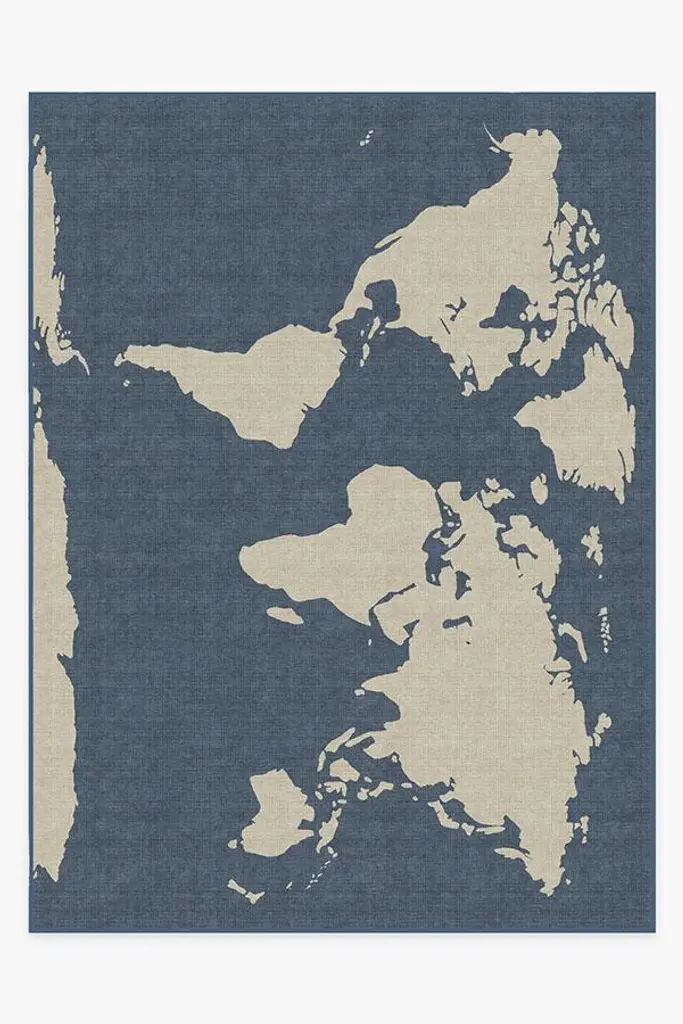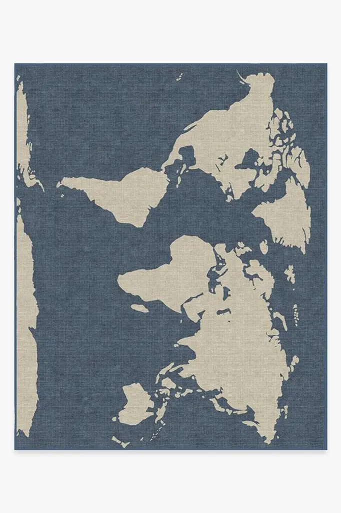 This contemporary World Map Blue rug displays a graphic mercator projection motif in tones of blue and cream.