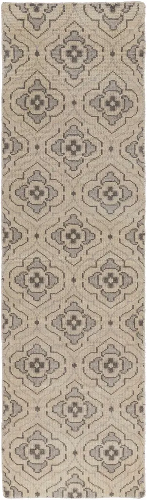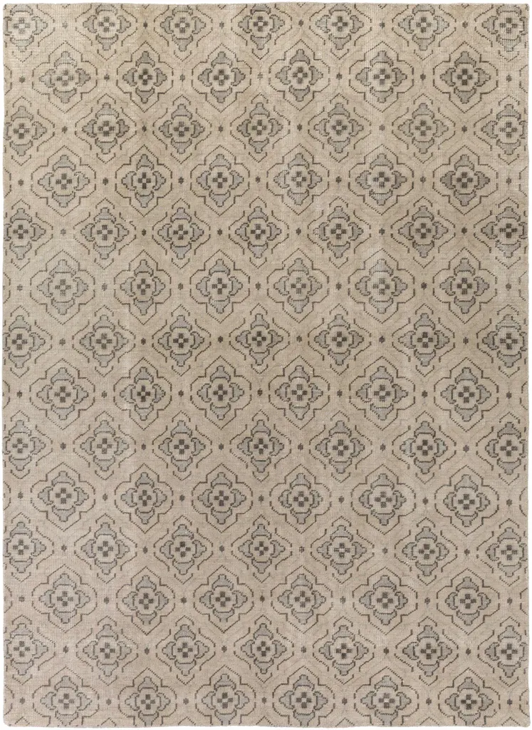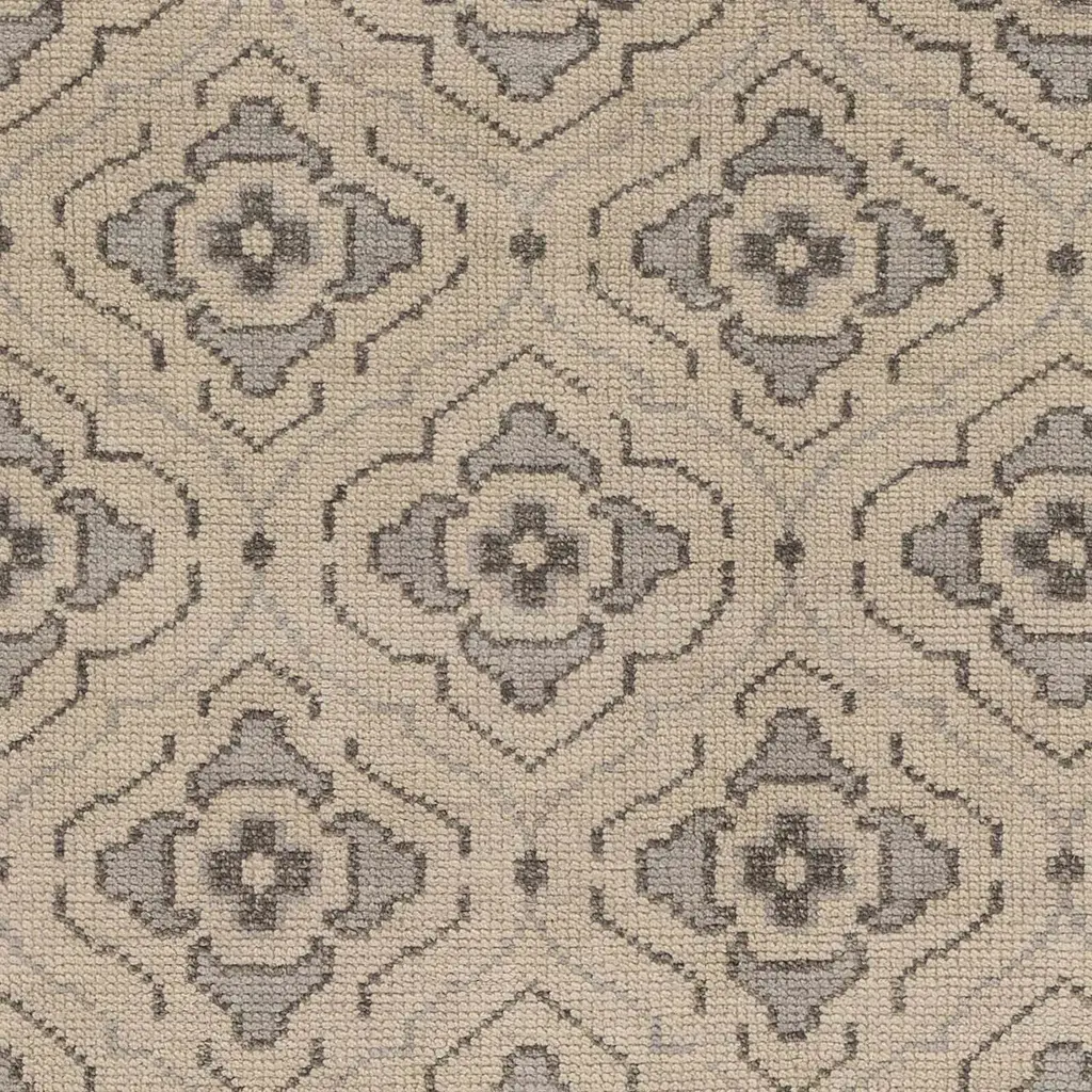Collection: Worley Colors: Beige, Charcoal, Peach Construction: Hand Knotted Material: 100% Wool Pile: Low Pile Pile Height: 0.07" Styles: Transitional Made In: India Thickness: 0.15" Price Range: $$$$$ (Affordable)