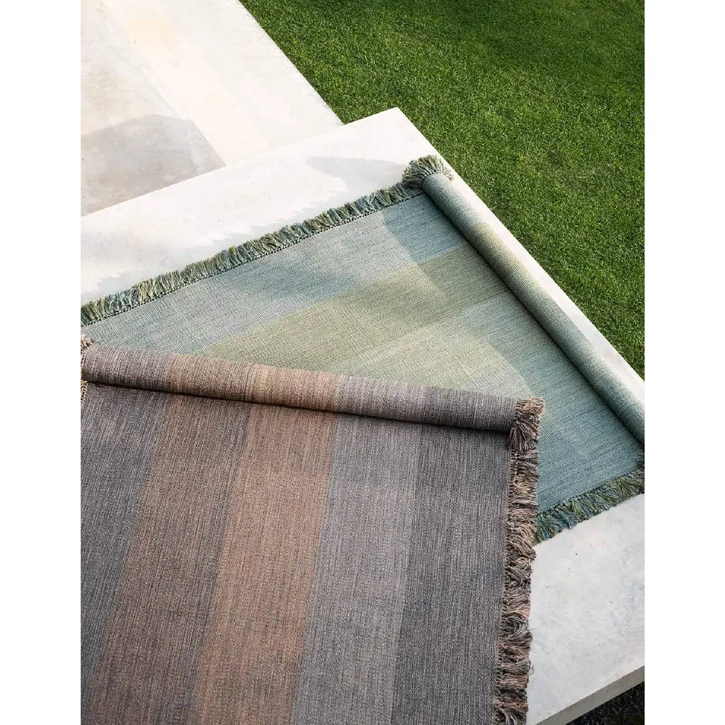 Like a natural cloak, TINT collection comes to life from a sophisticated combination of hues and yarns. The warm and cool tones of these outdoor carpets generate a harmonious and welcoming living space where the sunlight completes the handsome chromatic play of desaturated tones. The tastefully soft color palette, achieved through the interweaving of tinted yarns and completed by a fringe on the 3-meter side, derives from the collection design concept: creating a rug that stylishly blended with the natural surroundings of the outdoors, yet looked equally good in certain indoor spaces. TINT perfectly fits in spontaneous continuity the external environment, as if naturally covers the ground in perfect dialogue with the furnishings of the house.
