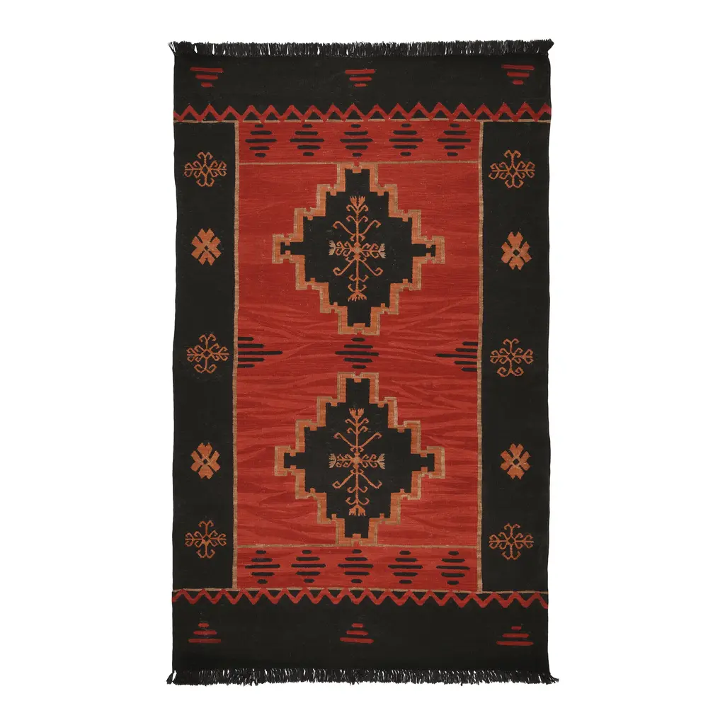 Hand-knotted from pure wool and colored with natural vegetable dyes, this Turkish kilim brings orange and red hues together to create a vibrant statement. With ornate motifs and geometric forms decorating the piece, this flat-woven, reversible rug is complemented with black fringing to both ends. This striking design brings and joy and vivacity to any interior. Features