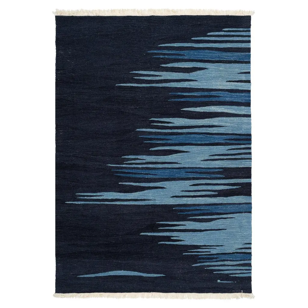 Yakamoz No 4 kilim rug is part of a series of kilims that take their inspiration from the poetry of light reflections on the sea surface. The abstract patterns, which are reminiscent of alternating color transitions created by reflected light, are handwoven into these kilims by Anatolian weavers. The name Yakamoz is a special Turkish word meaning bioluminescence, describing the beautiful sight of the moonlight shining over the surface of the sea.Yakamoz is a collection of kilim rugs that reinterpret centuries old craft traditions of Anatolian kilim weaving with a modern, artisanal and sensual design approach. Inspired by the legendary sight of the reflected moonlight over the Agean Sea, Yakamoz collection establishes a contemporary expression at the intersection of design, craft and art. The collection brings a piece of Agean coastal nature and spirit to the everyday life of interiors. Yakamoz Kilim Collection received EDIDA - Elle Decoration International Design Awards in 2020, in Turkey and International Iron A' Design Award in 2021.Yakamoz kilims are handwoven by skilled Anatolian weavers based on kilim weaving technique (flat-weave) using 100% Anatolian sheep wool. The handwoven nature gives each kilim rug its one and only and distinctive character. As our kilims are handwoven, there may be slight variations in colors, size and shapes.Material: 100% woolDimensions: 180 cm x 240 cmCan be custom sized and colored.