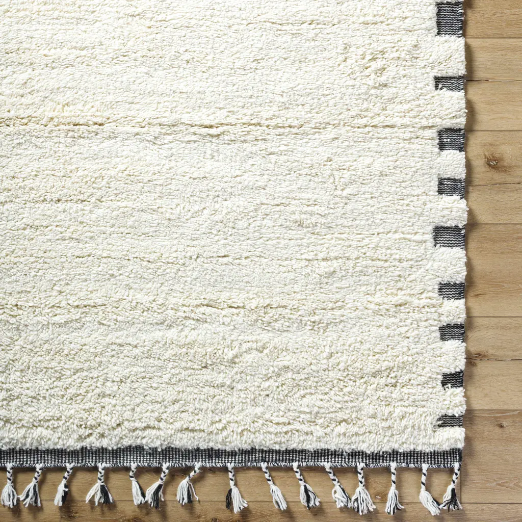 Collection: Yamin Colors: Pearl Construction: Hand Woven Material: 100% Wool Pile: High Pile Pile Height: 1" Styles: Transitional,Bohemian Made In: India Thickness: 1.2" Fringe Length: 5" Price Range: $$$$$ (Affordable)