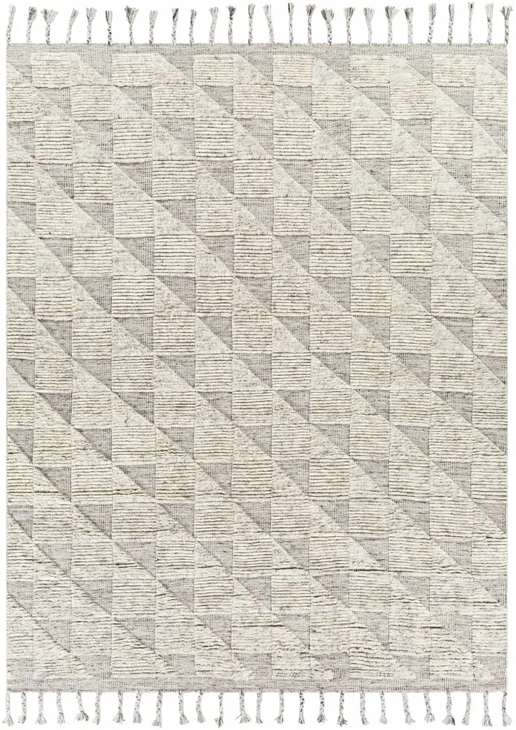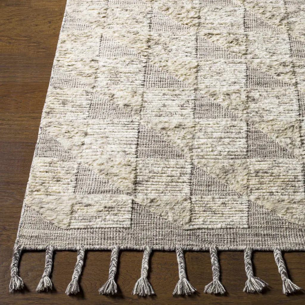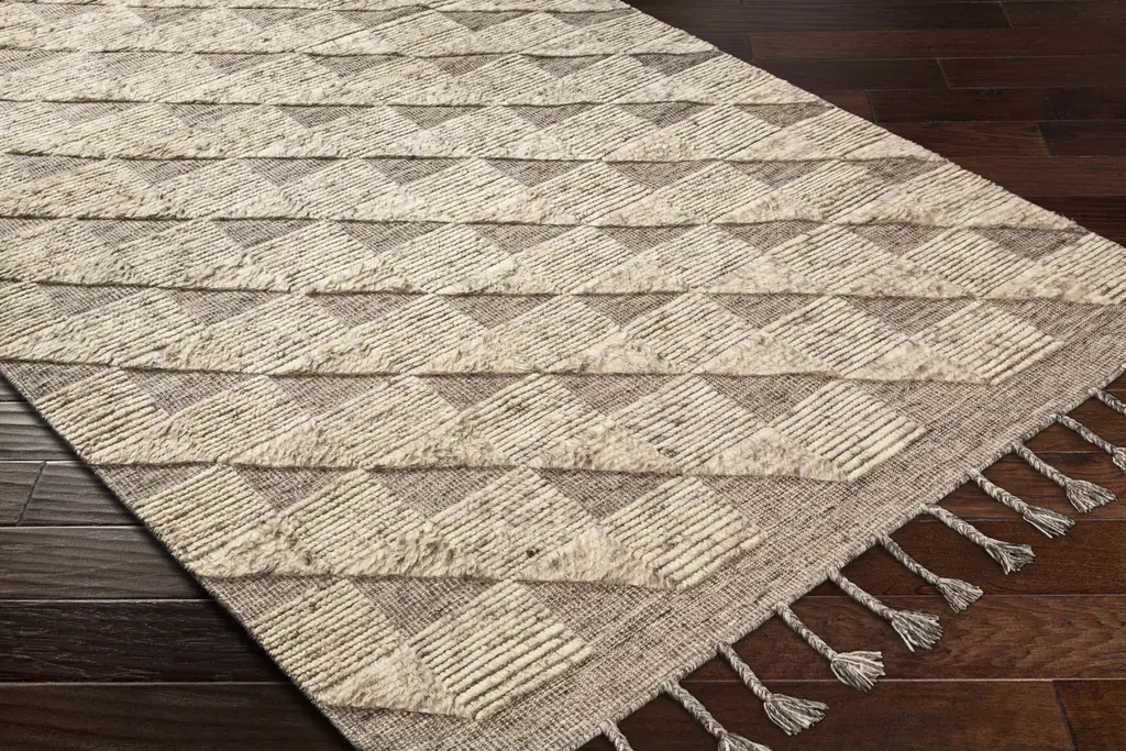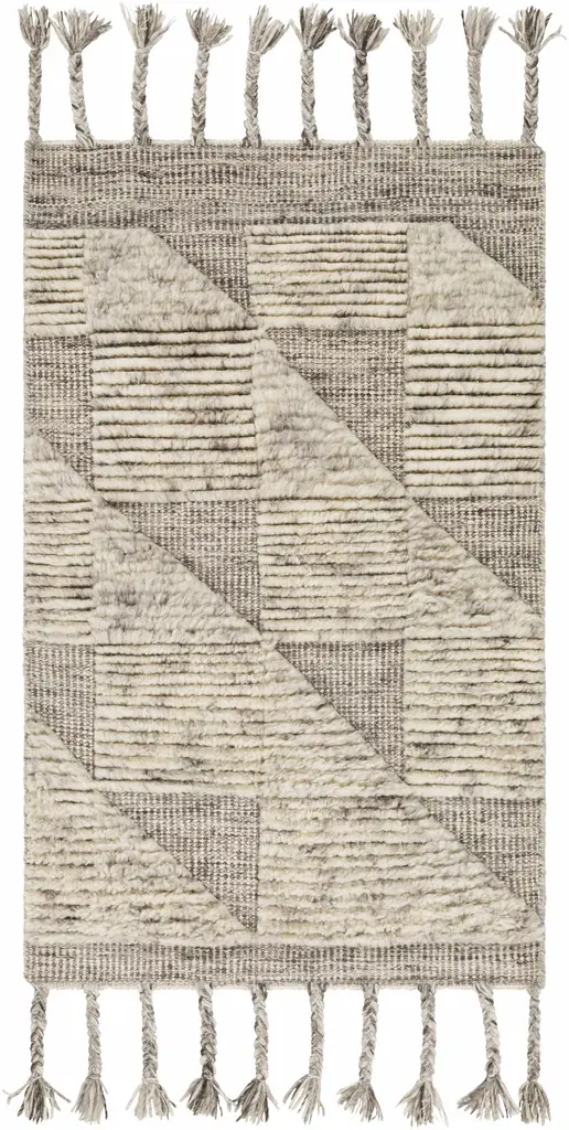 Collection: Yarravel Colors: Dark Brown, Ivory, Medium Gray, Charcoal Construction: Hand Knotted Material: 100% Wool Pile: Medium Pile Pile Height: 0.39" Styles: Transitional,Bohemian Made In: India Thickness: 0.59" Fringe Length: 6" Price Range: $$$$$ (Affordable)