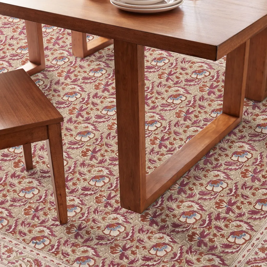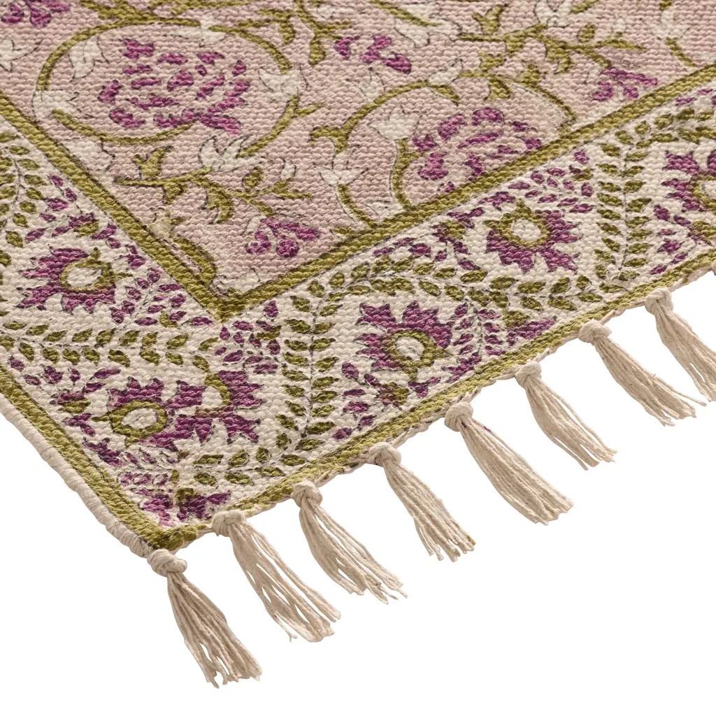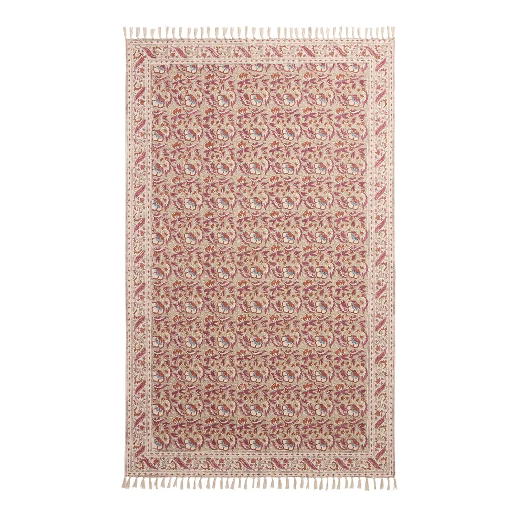 Block printed by hand with a unique floral design and palette on each side, our 5x8 Yasemin reversible rug is two works of art for the price of one. Traditional artisans in Jaipur, India, carve wooden stamps for each pattern, inking and pressing them into the cotton base one color at a time. With a pink ground on one side and mushroom-brown on the reverse, the subtle variations of each multicolor design highlight their handmade character.