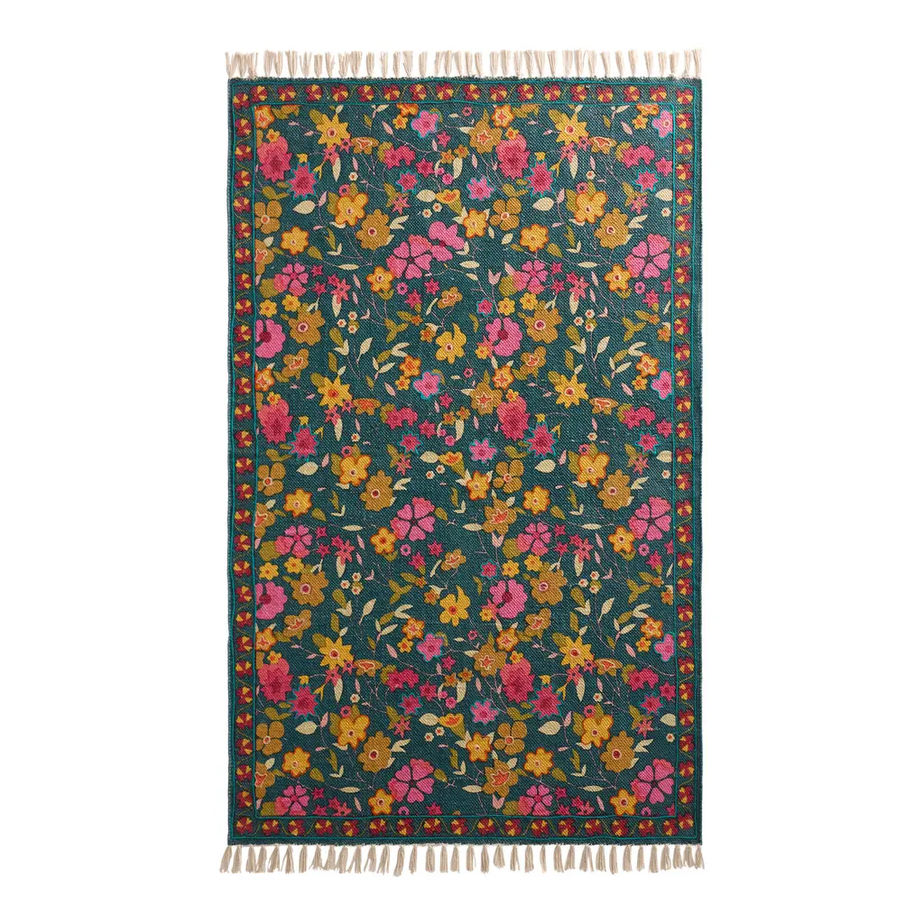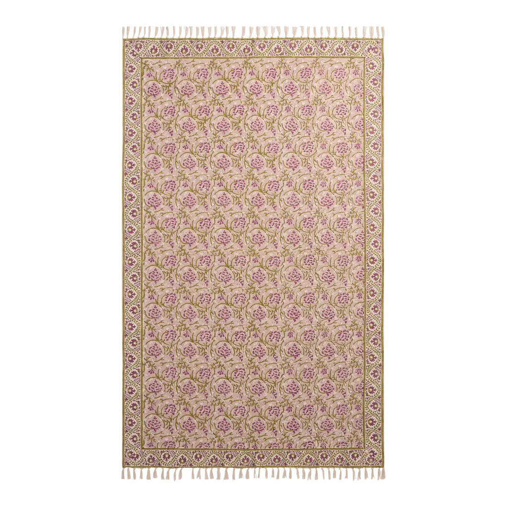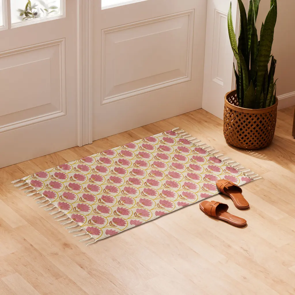 Our 2x3 Yasemin reversible rug is block printed by hand in a palette of yellow, red, and ivory with a splendid, wholly unique floral design on each side. Traditional artisans in Jaipur, India, carve wooden stamps for each pattern, meticulously inking and pressing them into the cotton rug one color at a time. The result is two works of art for the price of one - the subtle variations of each small-space area rug tell the story of its making.