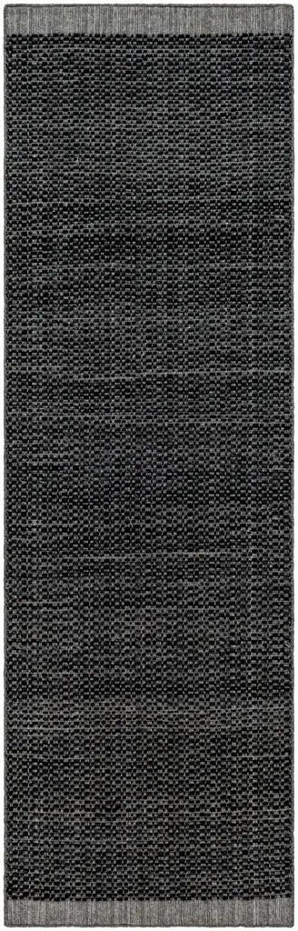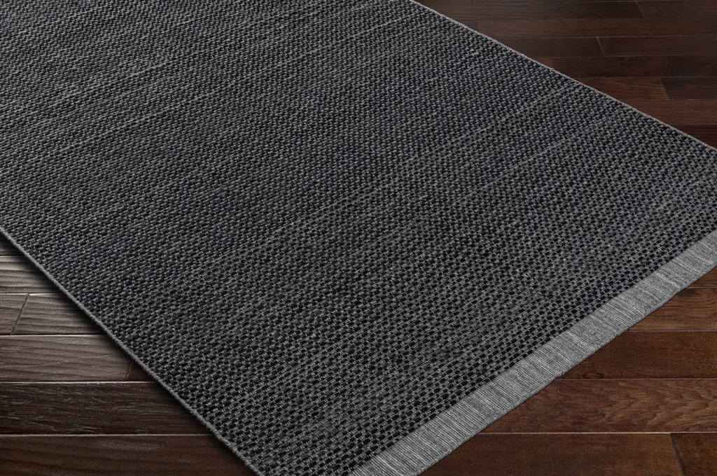 Collection: Yuna Colors: Black, Charcoal Construction: Hand Loomed Material: Face: 100% RecycledPETYarn / Warp: 100% RecycledPETYarn Pile: Low Pile Pile Height: 0.19" Styles: Transitional,Traditional Made In: India Thickness: 0.31" Price Range: $$$$$ (Affordable)
