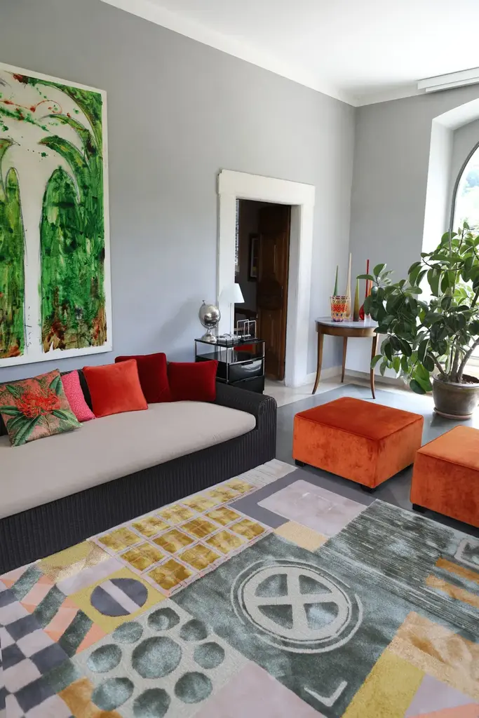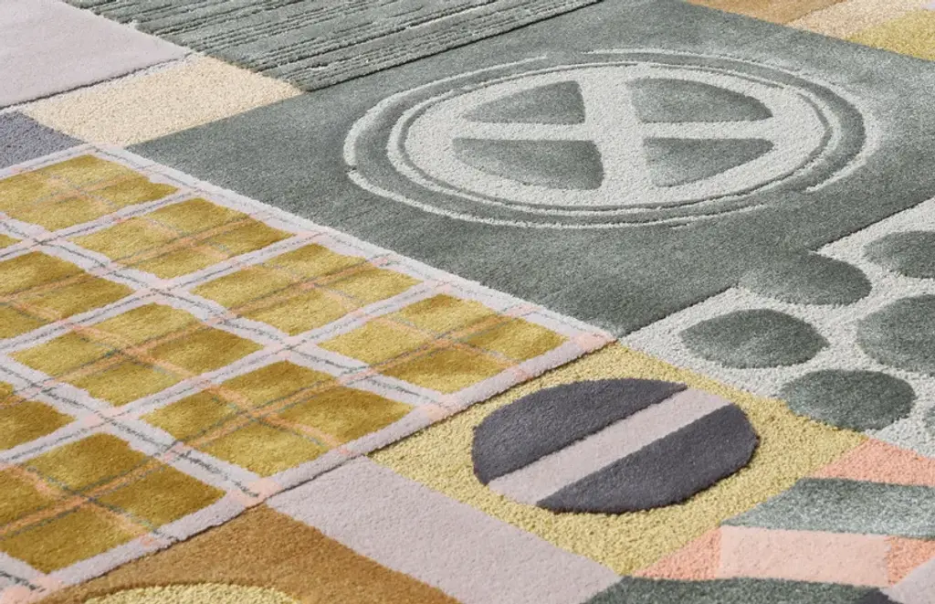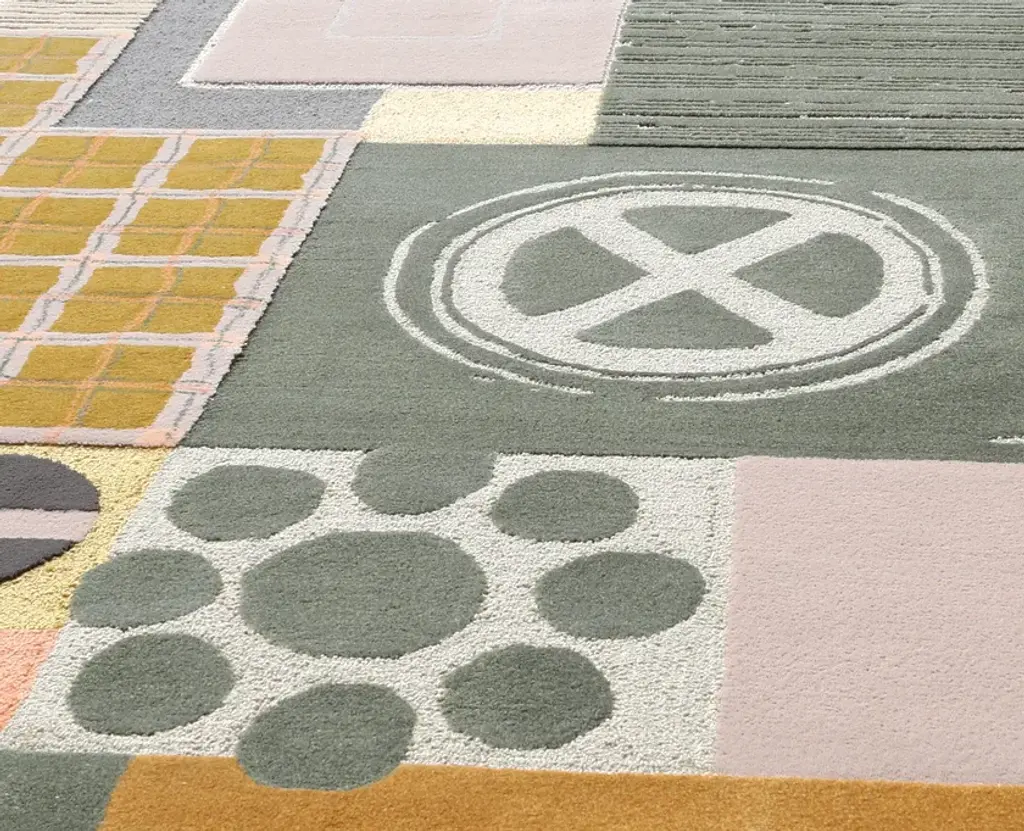 Ysoy is a hand-tufted geometric rug on multiple levels in New Zealand wool, linen, Hardtwist and Tencel.A collection between fashion and design, made up of hand-tufted flowers, carpets and wall-hangings based on Ken Scott’s archive designs. A tribute to the famous painter and eclectic designer who marked fashion and design trends in the 60s and 70s. The carpets show the world of Ken Scott, made of colour, irony, spectacular flowers, animals and childish abstract shapes.