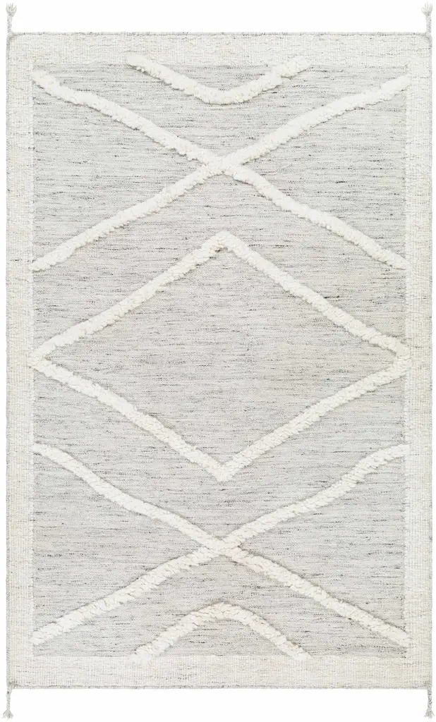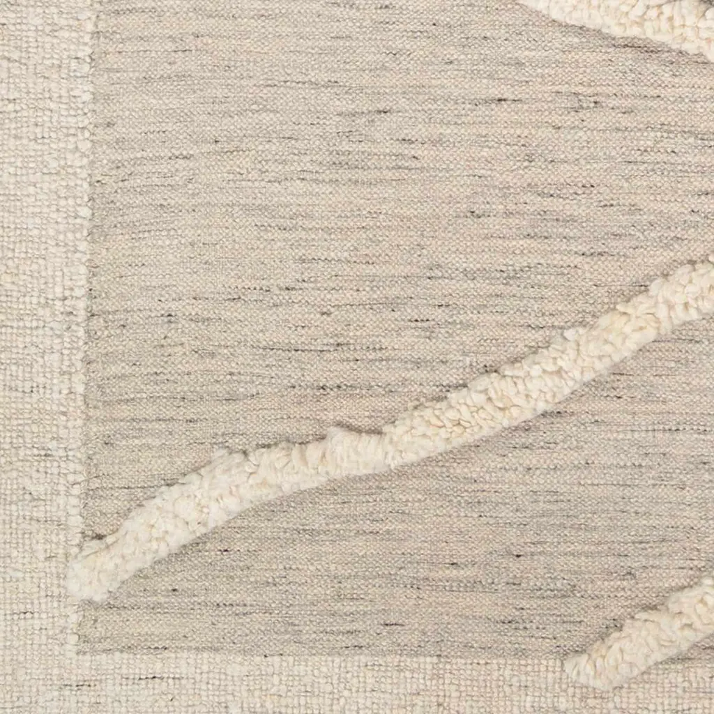Collection: Yutu Colors: Beige, Cream, Charcoal Construction: Hand Knotted Material: 100% Wool Pile: Medium Pile Pile Height: 0.45" Styles: Transitional,Bohemian Made In: India Thickness: 0.7" Price Range: $$$$$ (Affordable)
