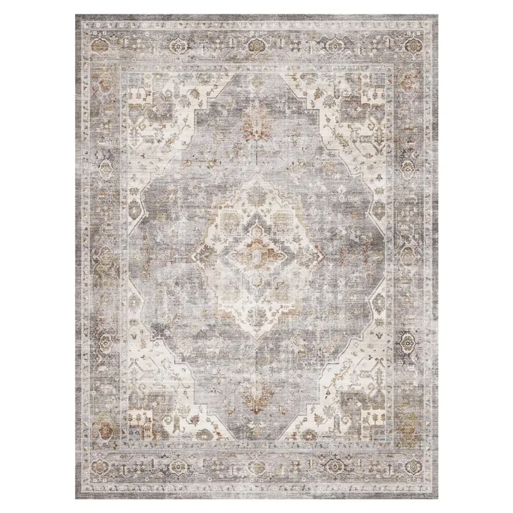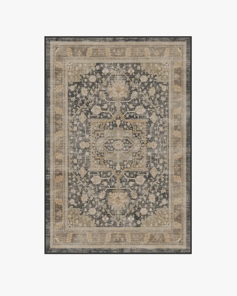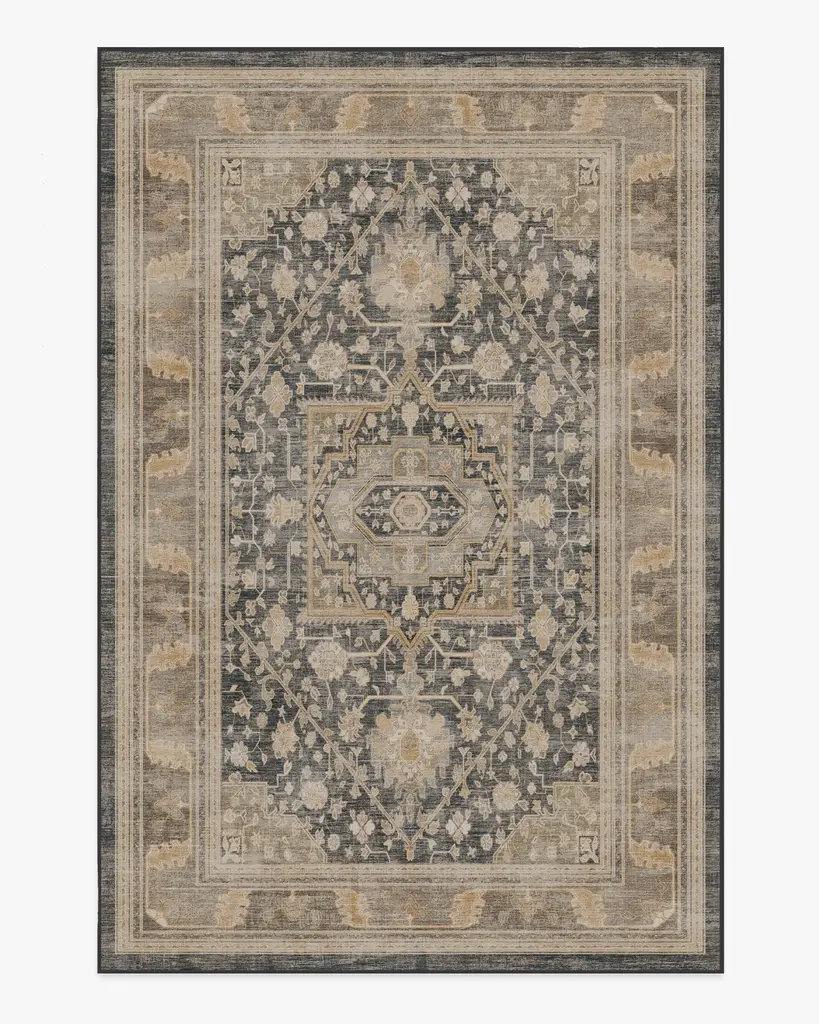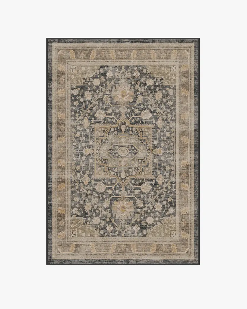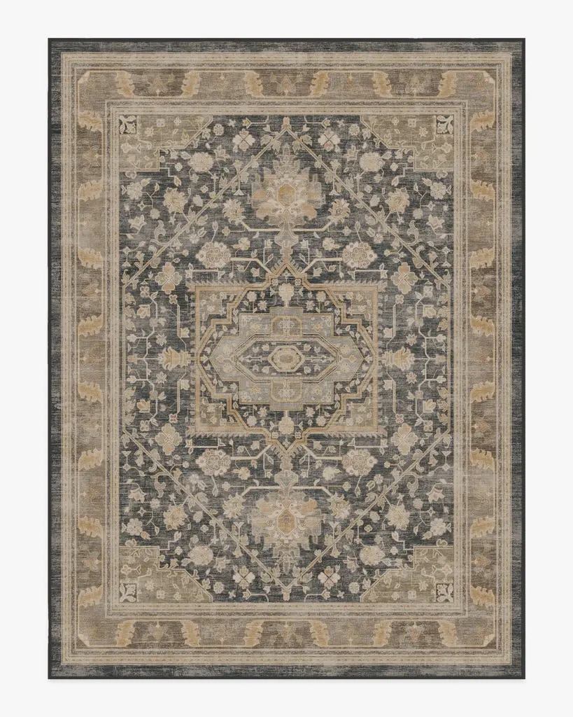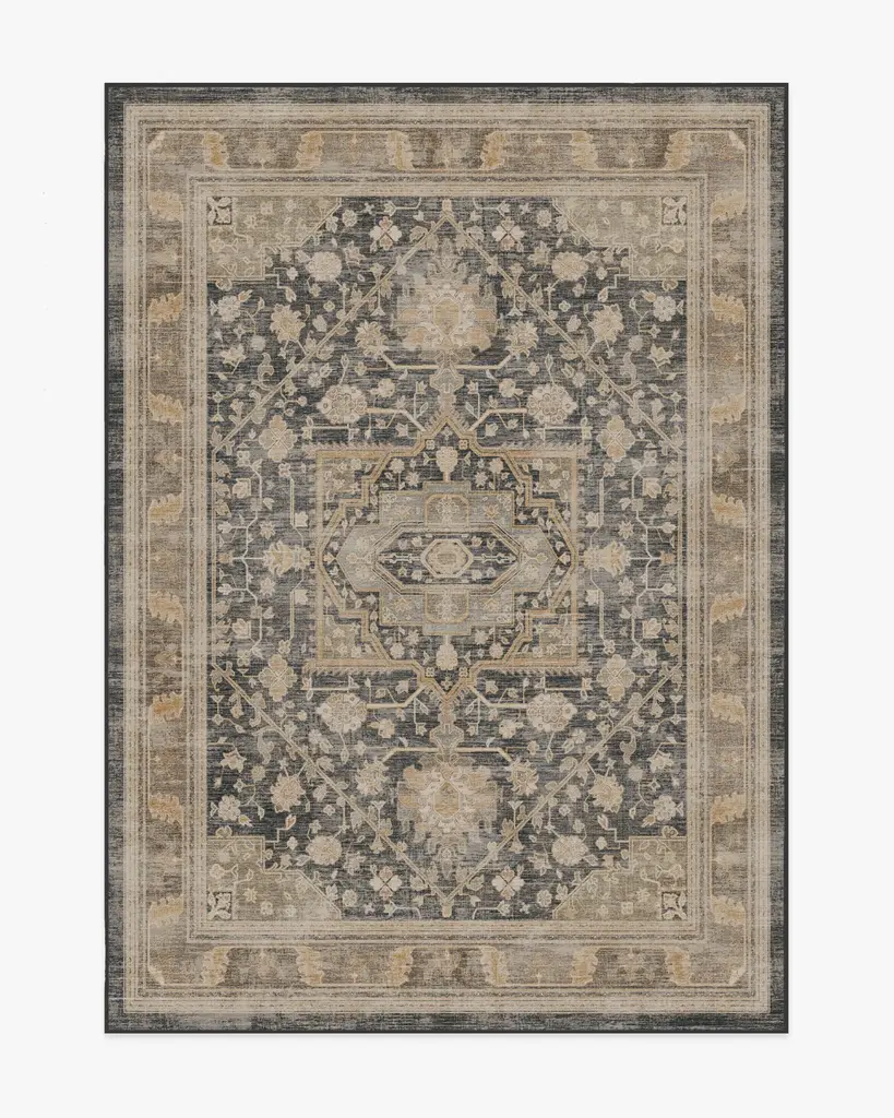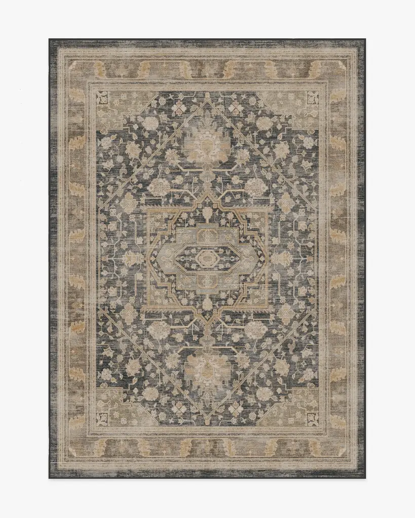 Warm. Welcoming. Washable. Inspired by traditional heritage rugs, world travel, and historical architecture, our Zahra Ink & Vintage Citron Rug features an artistic and geometric design. Its vintage color palette showcases rich black-navy tones, soft gold accents, and hints of sages that give a beautiful citron feel. Water-resistant, stain-resistant, and machine-washable. Rug colors may vary slightly according to your device and the lighting in your space.