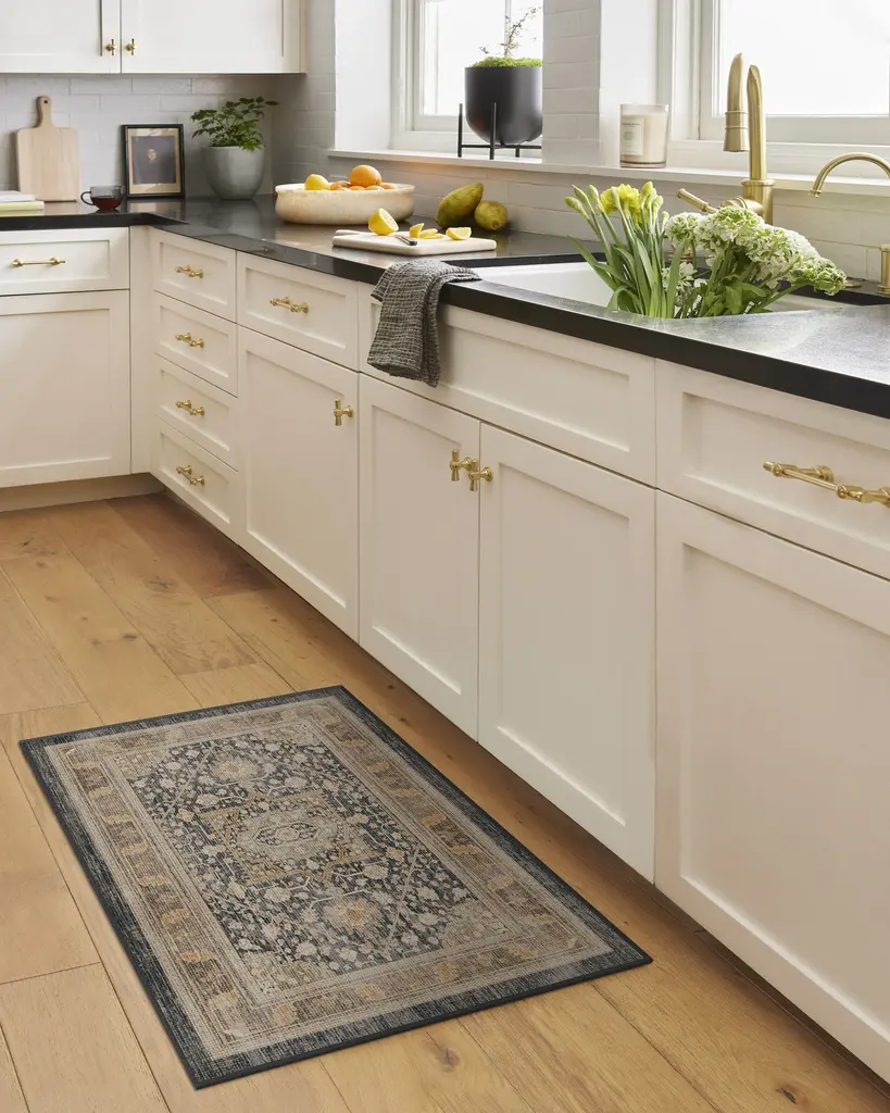 Warm. Welcoming. Washable. Inspired by traditional heritage rugs, world travel, and historical architecture, our Zahra Ink & Vintage Citron Rug features an artistic and geometric design. Its vintage color palette showcases rich black-navy tones, soft gold accents, and hints of sages that give a beautiful citron feel. Water-resistant, stain-resistant, and machine-washable. Rug colors may vary slightly according to your device and the lighting in your space.