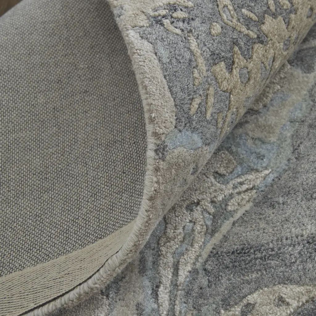 Collection: Zarah Colors: Gray, Tan, Blue Construction: Hand Tufted Material: Face: Viscose, Wool / Warp: Cotton Pile: Medium Pile Pile Height: 0.59" Styles: Contemporary,Industrial,Bohemian & Eclectic Backing: Cotton Made In: India Thickness: 0.59" Price Range: $$$$$ (Premium)