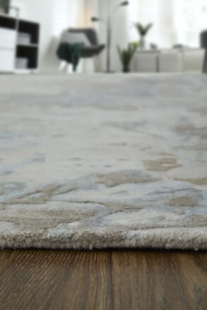 Collection: Zarah Colors: Gray, Tan, Blue Construction: Hand Tufted Material: Face: Viscose, Wool / Warp: Cotton Pile: Medium Pile Pile Height: 0.59" Styles: Contemporary,Industrial,Bohemian & Eclectic Backing: Cotton Made In: India Thickness: 0.59" Price Range: $$$$$ (Premium)